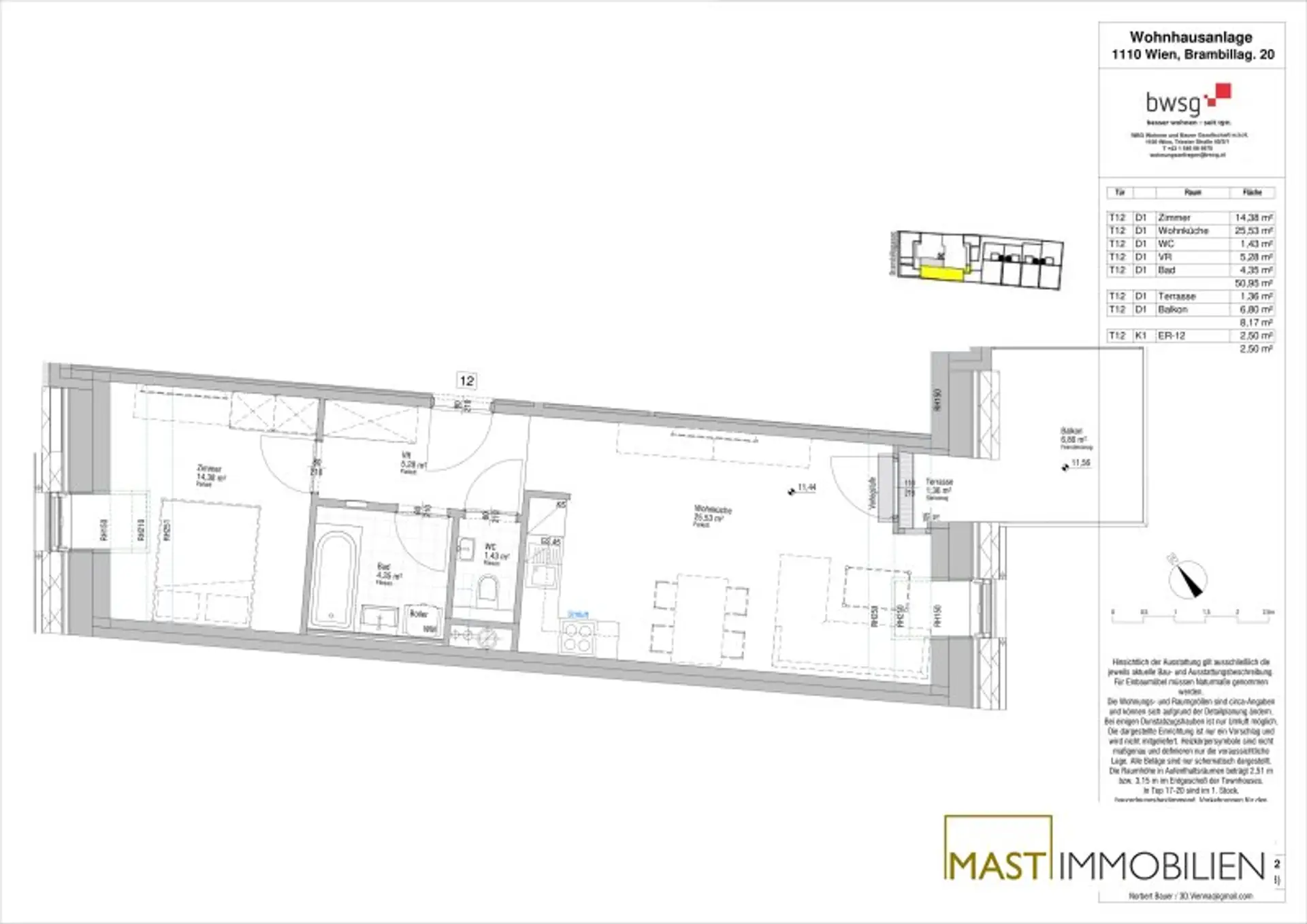 Die Wohnung befindet sich im 4. Liftstock (1. Dachgeschoss) und verfügt über 50,95 m² Wohnfläche + eine ca. 8,17 m² große Freifläche.