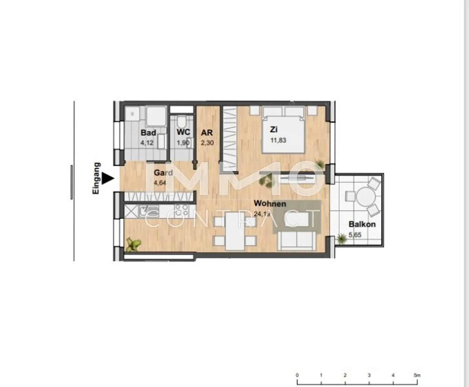 Vom Wohnungseingang gelangt man in die Garderobe mit direktem Zugang zum Badezimmer mit Wanne, zum WC mit Waschbecken und Fenster und zum Wohnbereich. Dieser ist mit einer Einbauküche sowie Platz für Essen und Wohnen ausgestattet. Zudem erfolgt der Zugang zum Schlafzimmer über diese Räumlichkeit. Der Wohnbereich verfügt über Fenstertüren zum Balkon.