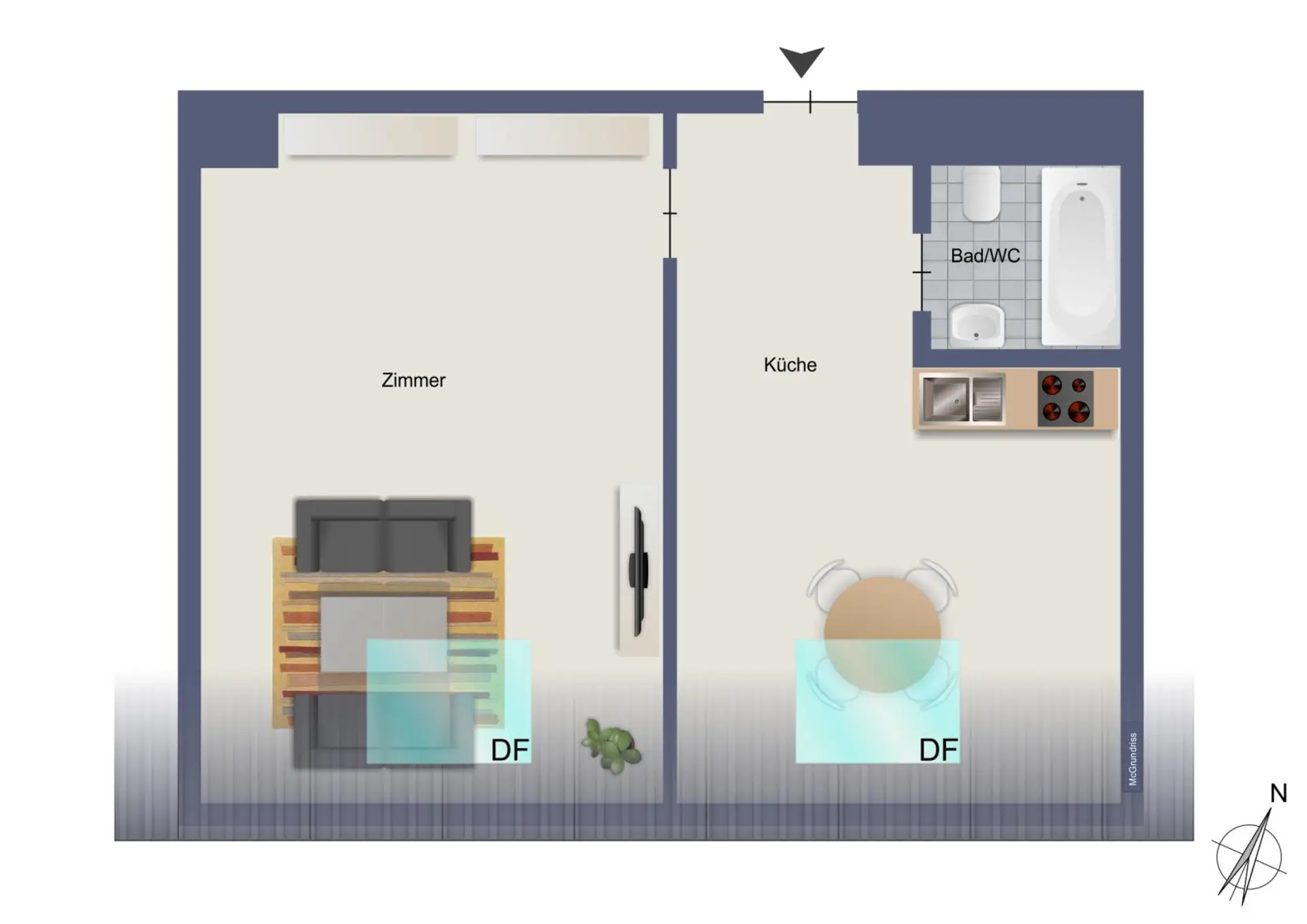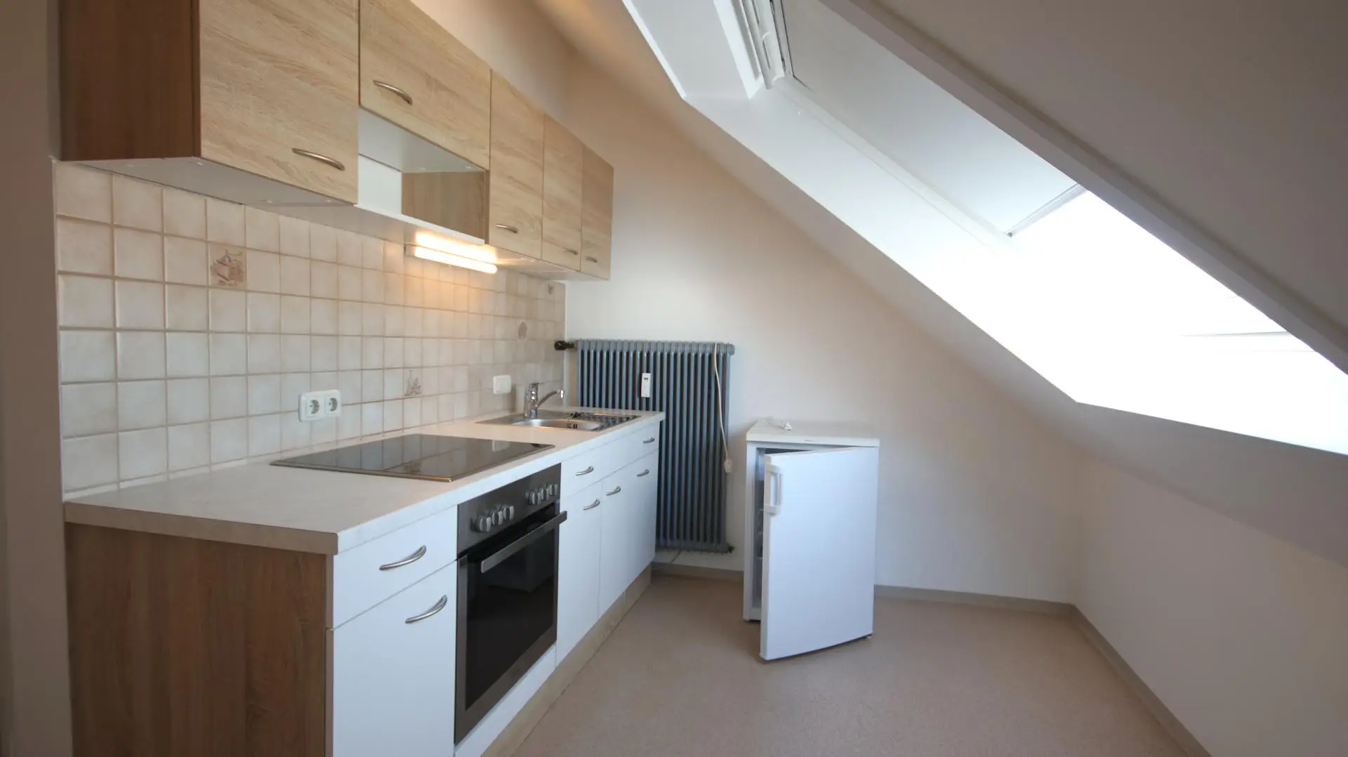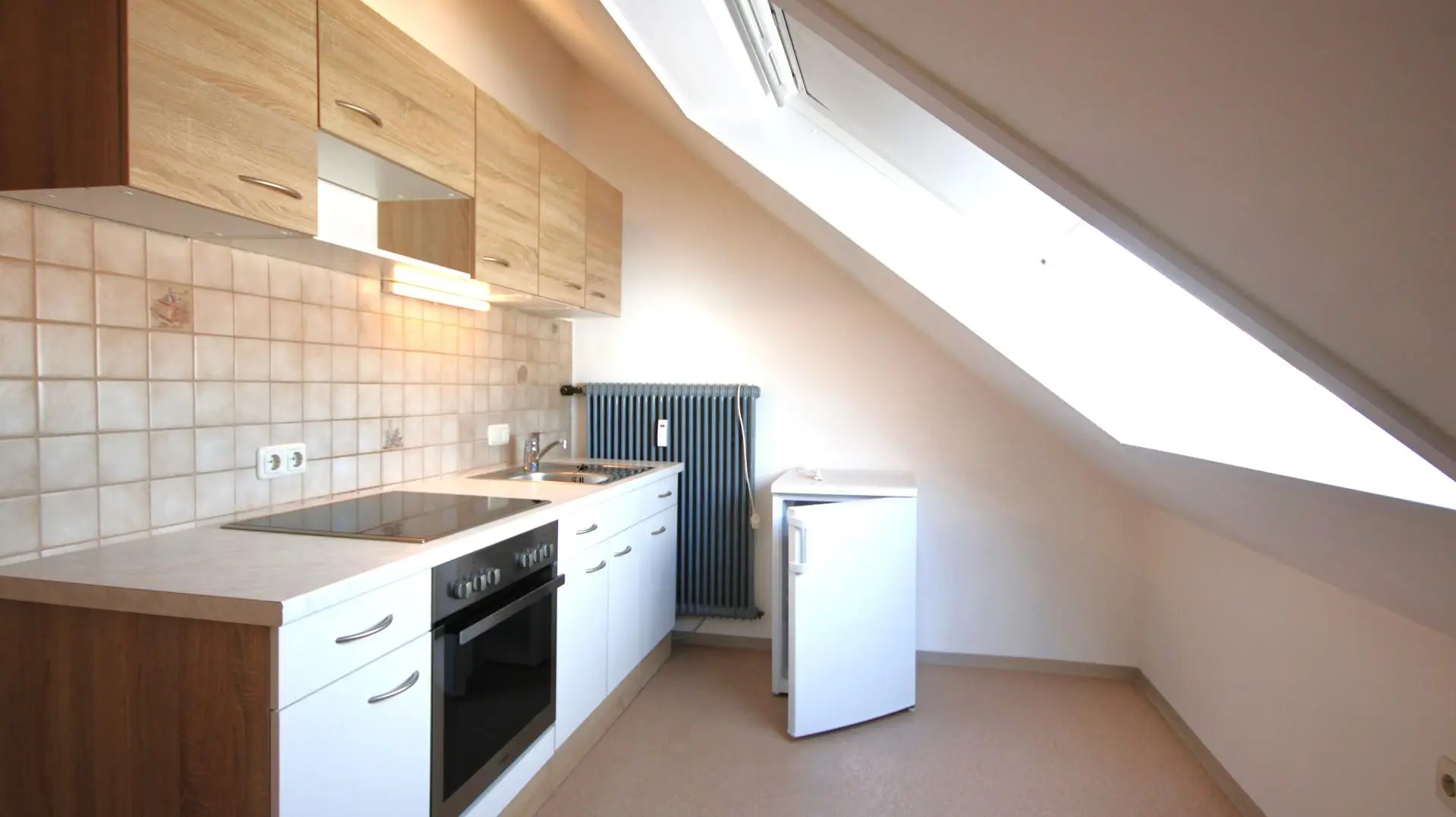 Die Wohnung besticht durch Ihr geräumiges Wohn-/Schlafzimmer und die großen Dachfenster sorgen für viel Tageslicht.