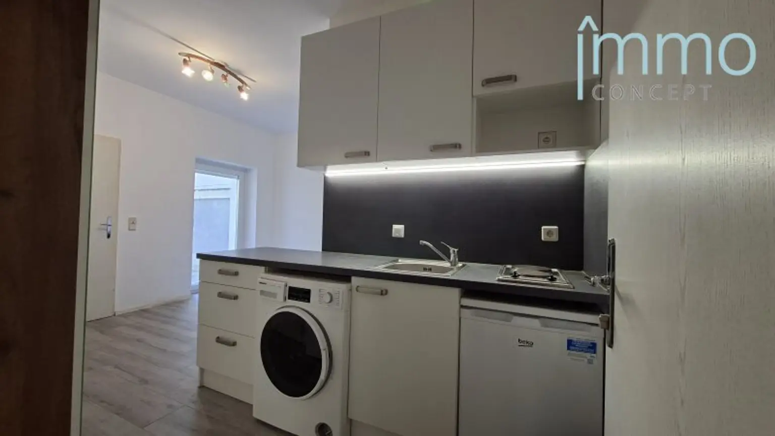 - Eingangsbereich/ Küche mit Kühlschrank und Kochmulde/ Vorratsschrank, Waschmaschinenanschluss