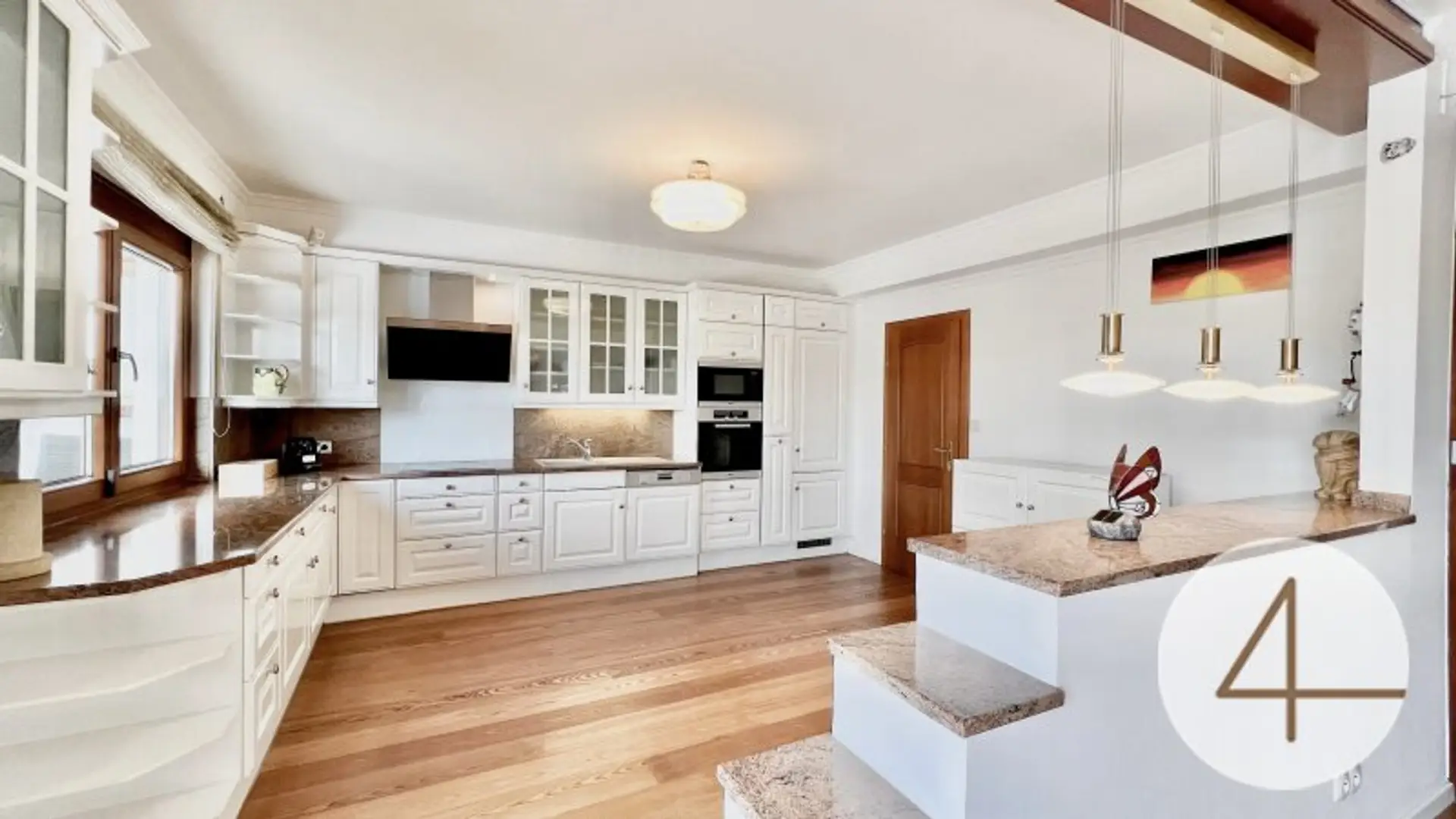Diese edle Villa bietet auf rund 310 m² Wohnfläche ein durchdachtes Zuhause mit viel Platz für Familie, Gäste, Homeoffice und Erholung. Auf vier Ebenen verteilen sich insgesamt acht großzügige Räume, zwei Terrassen, ein Balkon sowie besondere Ausstattungsmerkmale wie eine private Schwimmhalle mit Sauna und direktem Zugang ins Freie, ein Heimkino mit Bar, ein Fitnessraum und ein maßgeschneidertes Hundebad im Erdgeschoss.