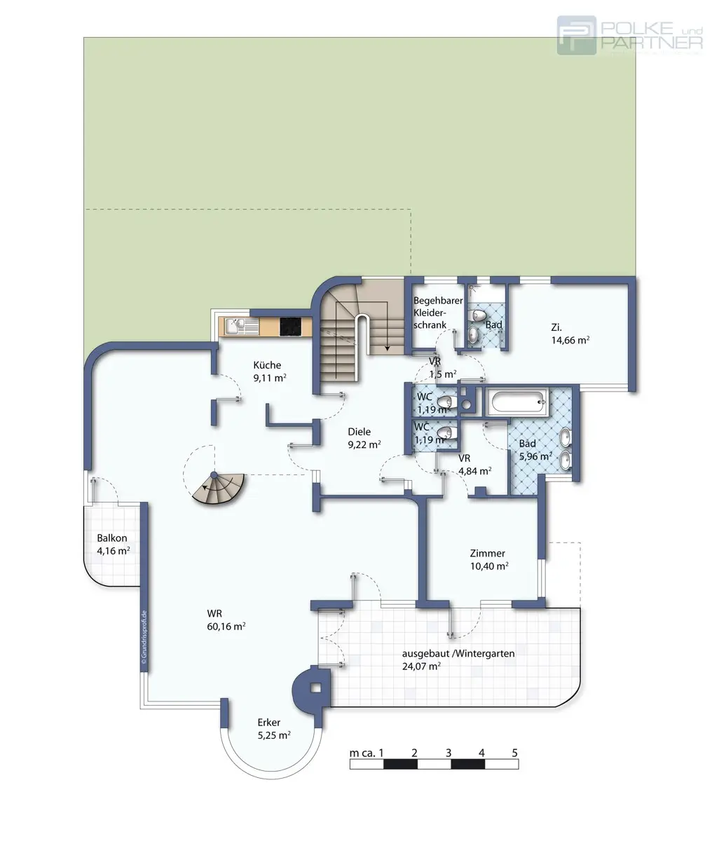 Der Wohnbereich beeindruckt durch ein rund 60 m² großes, lichtdurchflutetes Wohnzimmer, das sowohl Zugang zu einem Balkon als auch zu einem ausgebauten Wintergarten bietet. Der charmante, leicht abgesetzte Erkerbereich mit offenem Kamin und einer einladenden Rundsitzbank ist der ideale Ort, um zu entspannen und gemütliche Stunden im Kreis der Familie oder mit Freunden zu genießen.