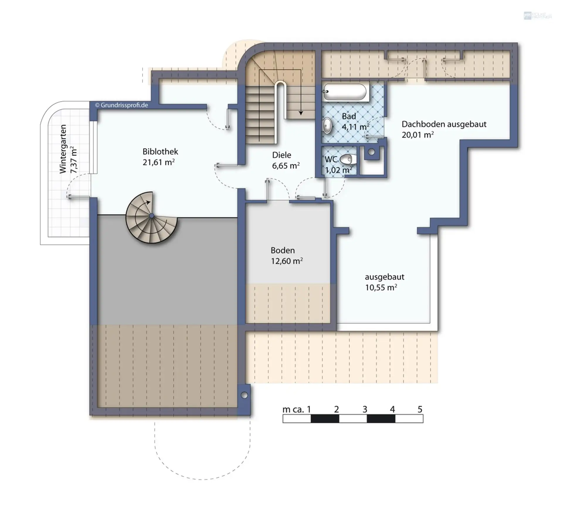 Vom Wohnbereich führt eine Wendeltreppe – alternativ auch das Stiegenhaus – in das Dachgeschoss. Hier befindet sich ein offener Galeriebereich, der sich ideal als Bibliothek oder Arbeitsbereich eignet, mit Zugang zu einem weiteren Wintergarten. Über die zentrale Diele gelangen Sie zudem in einen großzügig ausgebauten Dachboden, der als Studio mit eigenem Badezimmer und separater Toilette konzipiert wurde. Ein zusätzlicher Raum im Dachgeschoss bietet praktischen Stauraum und rundet das Raumangebot perfekt ab.