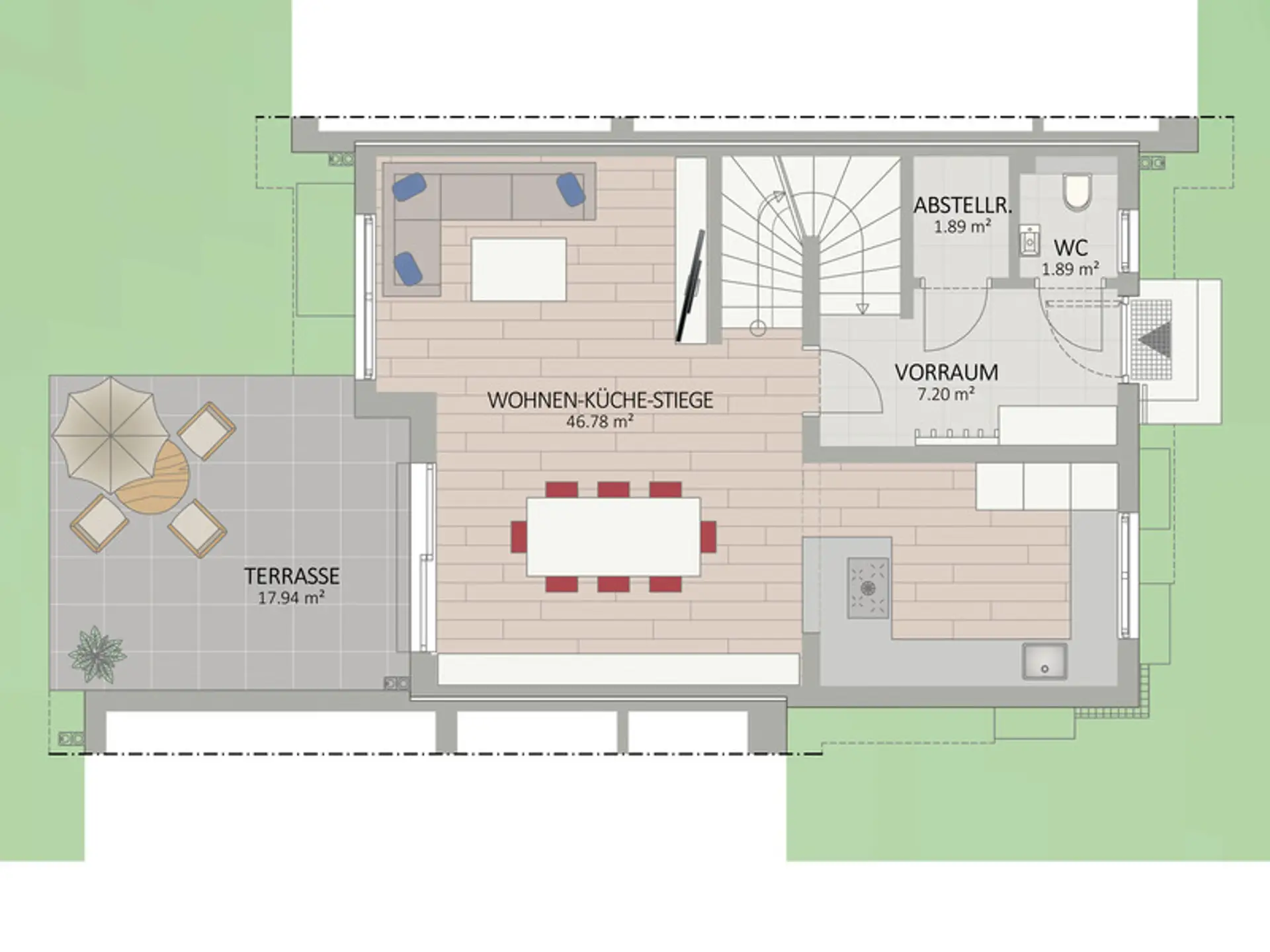 - Hochwertige Markenausstattung (Innenstiege vom Tischler, Feinsteinzeug-Fliesen, Holz-Alu-Fenster mit 3-fach Isolierverglasung, uvm.)