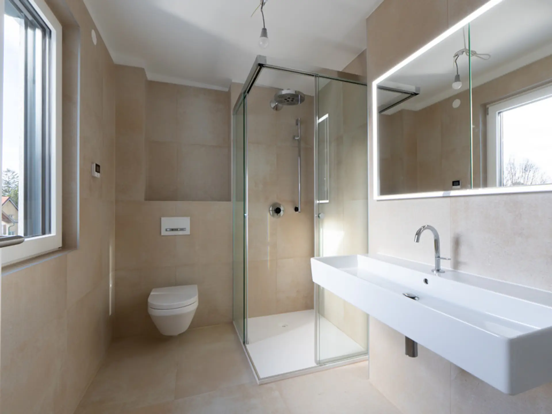 - Hochwertige Markenausstattung (Echtholzparkett, Innenstiege vom Tischler, Feinsteinzeug-Fliesen, Holz-Alu-Fenster mit 3-fach Isolierverglasung, uvm.)
