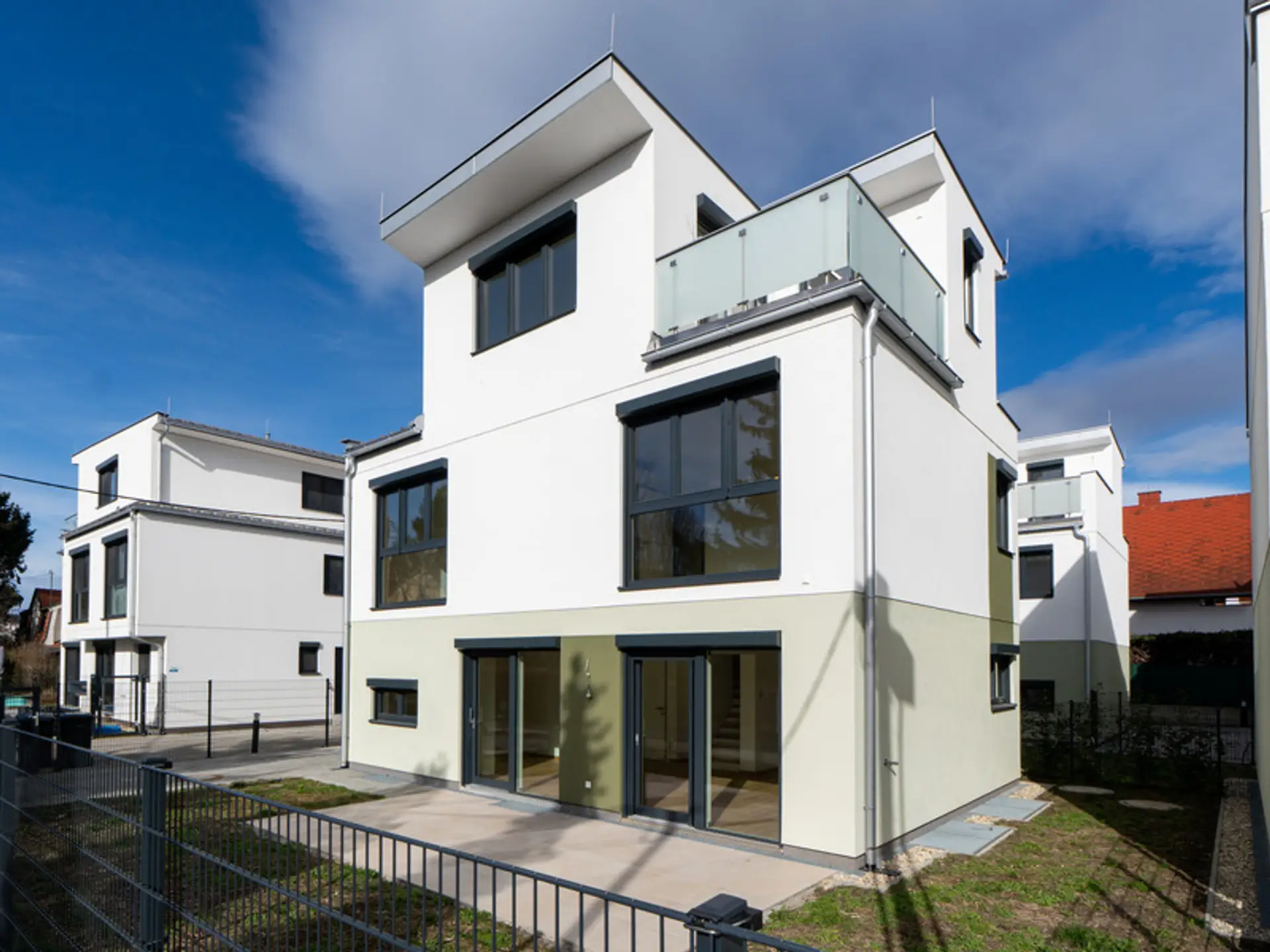 Hier in der Arminenstraße erwartet Sie das Beste aus den beiden Welten "Stadt und Natur" und eine absolute Rarität hier im Grätzel von Strandcafé und Bootshaus: Vier exklusive Einzelhäuser auf Eigengrund bieten Ihnen und Ihrer Familie – nur 200 Meter von der Alten Donau entfernt – geräumige Nettowohnflächen von [WNF], aufgeteilt auf [Zi] Zimmer, in moderner Architektur und mit ausgeklügelten Grundrissen. Bei der Ausstattung der Häuser haben wir wirklich an alles gedacht: von der Photovoltaikanlage samt black-outfähigem Pufferspeicher und Wallbox, über kleine und feine Annehmlichkeiten wie Wäscheabwurfschacht, flächenbündige Innentüren und ohnehin nur die absolut höchste Ausstattungsqualität mit regionalen und internationalen Topmarken wie Villeroy & Boch, Axor von Philippe Starck und hansgrohe, Scheucher Echtholzparkett und viele weitere mehr. In Ihrem eigenen Garten mit Terrasse genießen Sie Ihr tägliches Leben wie im Urlaub – und das an 365 Tagen im Jahr. Die Grundstücksgrößen liegen bei [GSF]. Und auch in den Keller gehen Sie beschwingt und lachend, denn dort erwarten Sie über 50 m² an weiterer Fläche, die Sie z.B. für Ihre Hobbys, Fitness oder ganz besonders ruhiges Arbeiten im Home-Office nützen können. Auch hier haben wir Wert auf entsprechend hochwertige Bodenbeläge und viel Licht gelegt. Jeder Moment, den Sie in Ihrem neuen Zuhause verbringen, soll und wird Ihnen Freude machen. Nehmen Sie uns beim Wort: Bei unseren Häusern stimmt einfach alles – wir planen mit architektonischer Sorgfalt und setzen die Projekte mit Liebe zum Detail um. Selbst die Zäune und Außenanlagen samt eigenen Parkplätzen sind bereits im Kaufpreis inkludiert!
