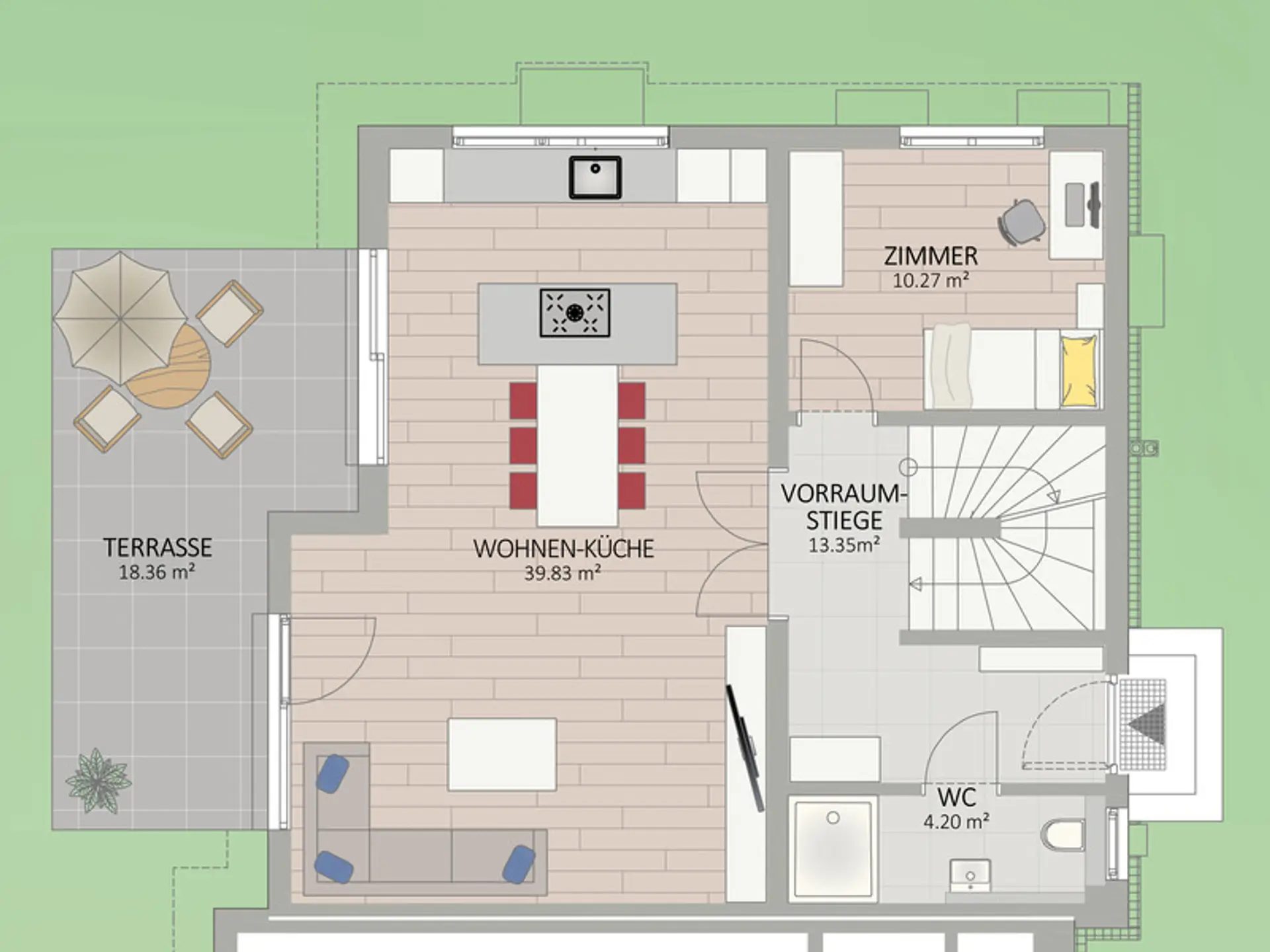 - Hochwertige Markenausstattung (Innenstiege vom Tischler, Feinsteinzeug-Fliesen, Holz-Alu-Fenster mit 3-fach Isolierverglasung, uvm.)