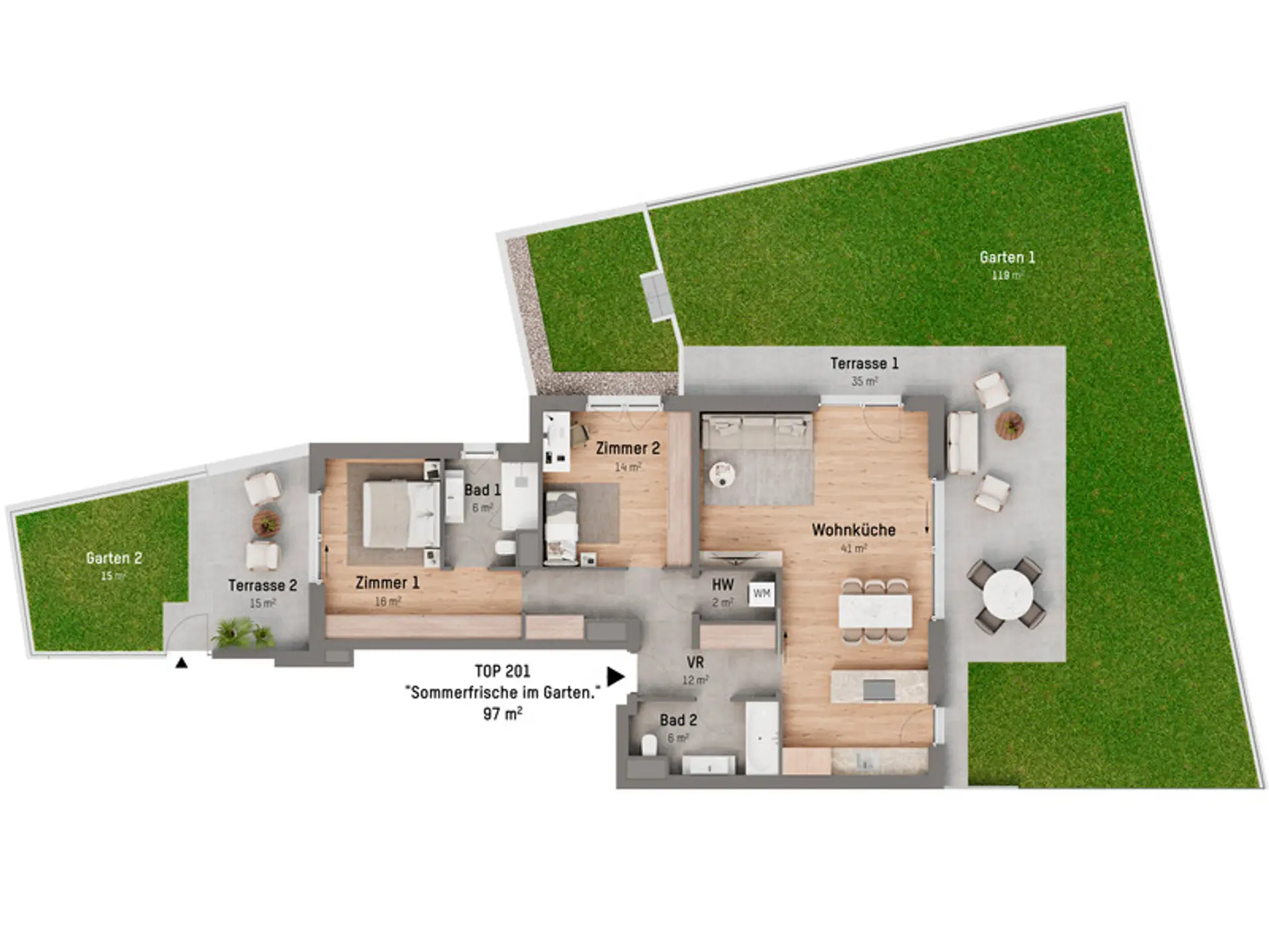 - Hochwertige Markenausstattung (Echtholzparkett, Feinsteinzeug-Fliesen, Holz-Alu-Fenster mit 3-fach Isolierverglasung, uvm.)