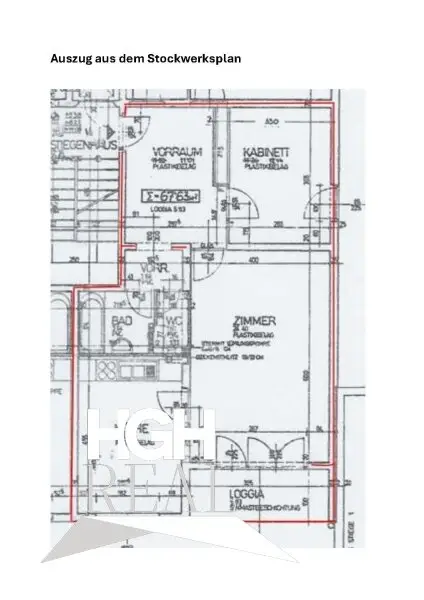Die ca. 74 m² große Wohnung (ca. 68 m² Wohnfläche plus Loggia mit ca. 6 m²) hat das Potenzial, durch Verlegung der Küche in das große Wohnzimmer ein zweites Schlafzimmer zu gewinnen. Sie liegt im 2. Liftstock und gliedert sich wie folgt: