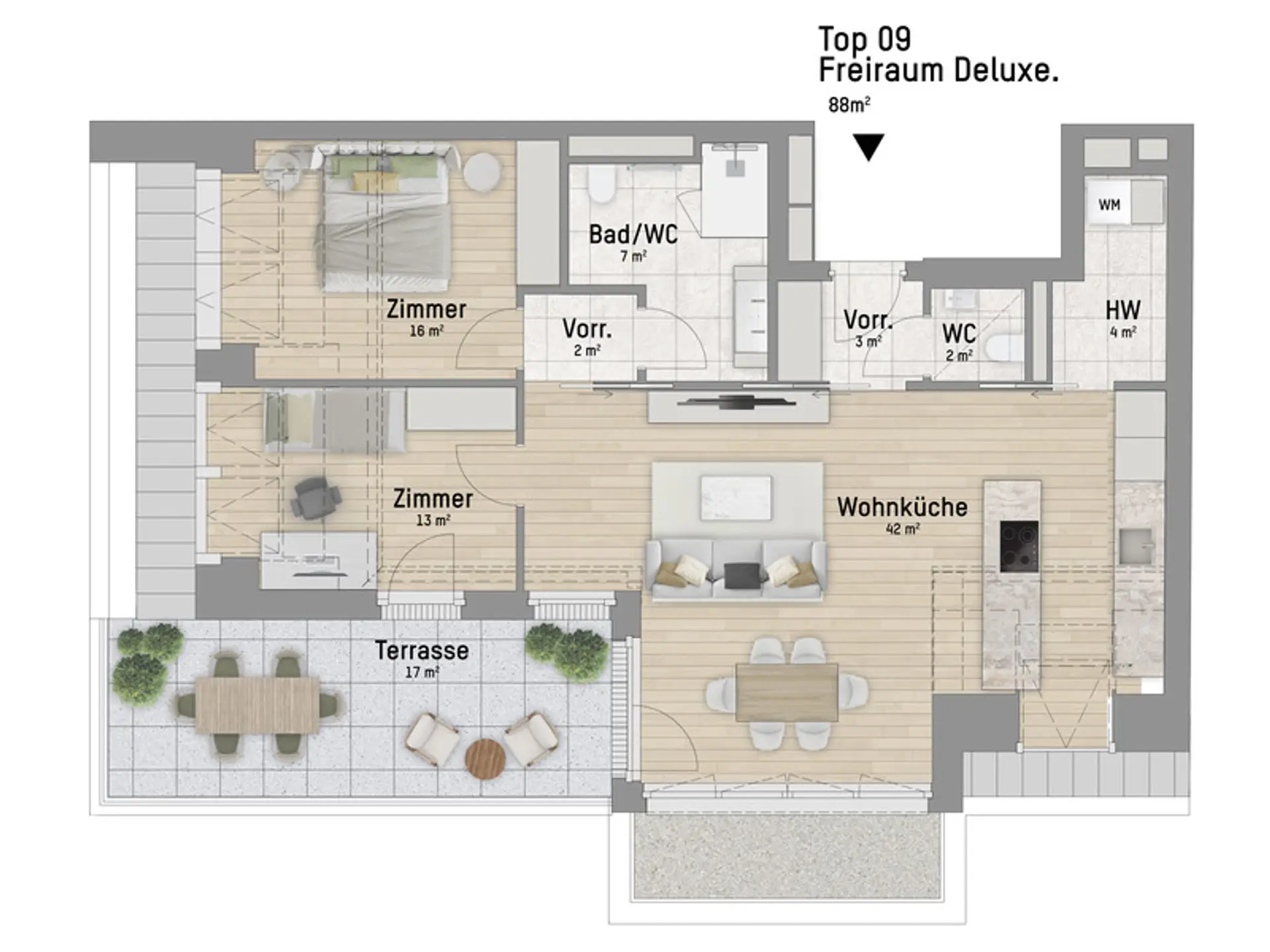 - Hochwertige Markenausstattung (Echtholzparkett, Feinsteinzeug-Fliesen, Holz-Alu-Fenster mit 3-fach Isolierverglasung, uvm.)