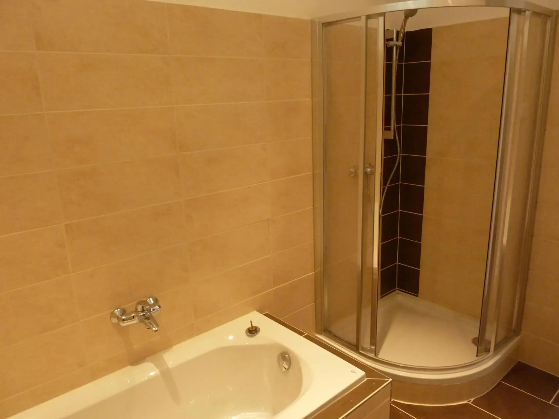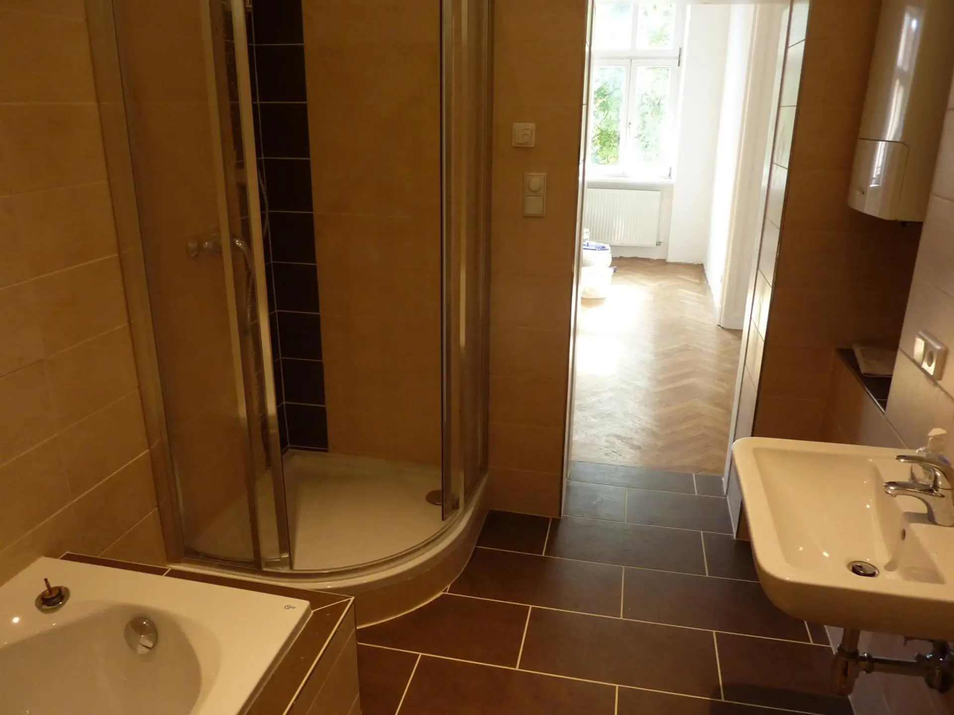• Badezimmer mit Fußbodenheizung, Badewanne und Dusche, Toilette