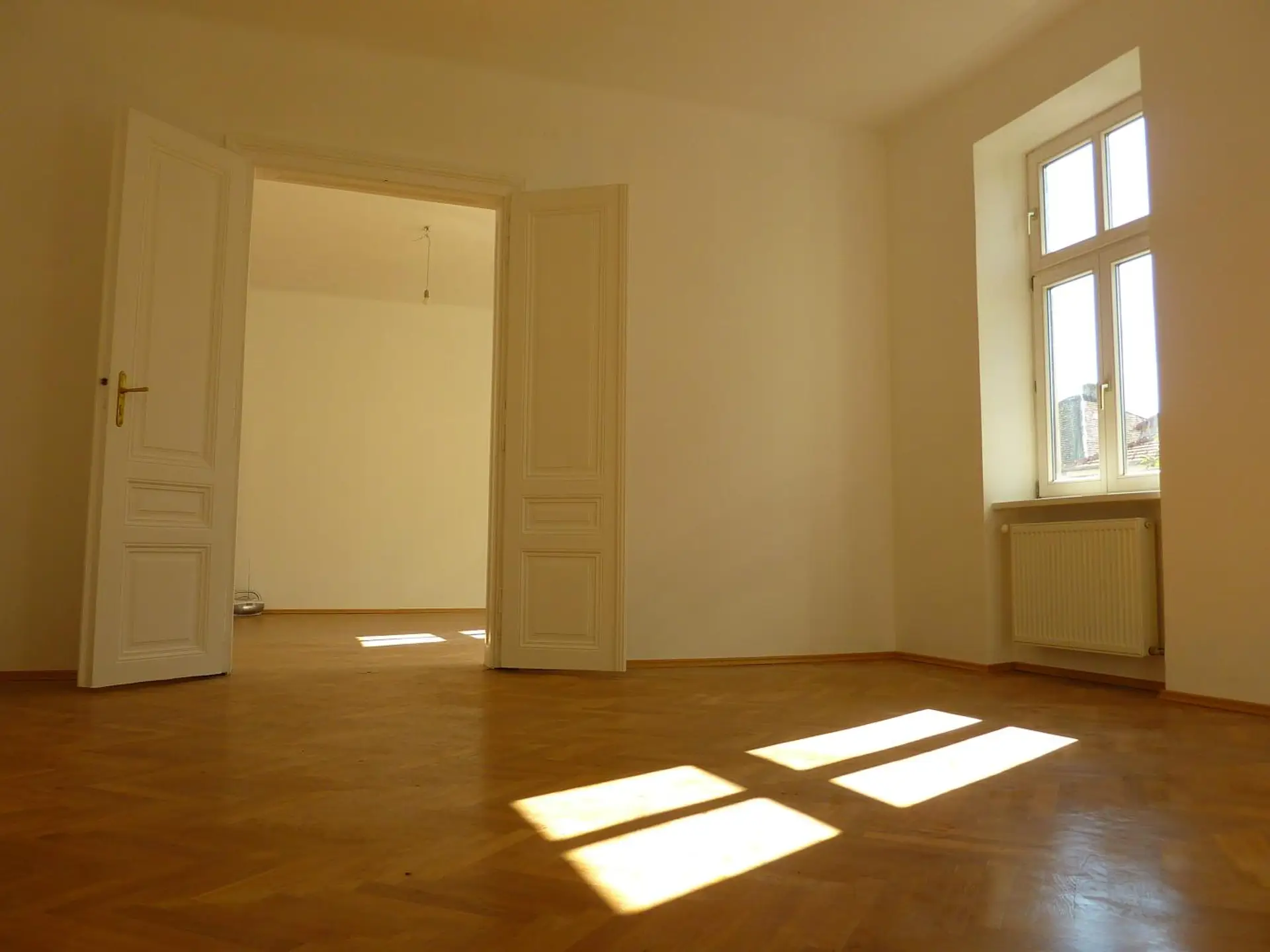 • Helles Wohnzimmer mit klassischen Flügeltüren und Fischgrätparkett