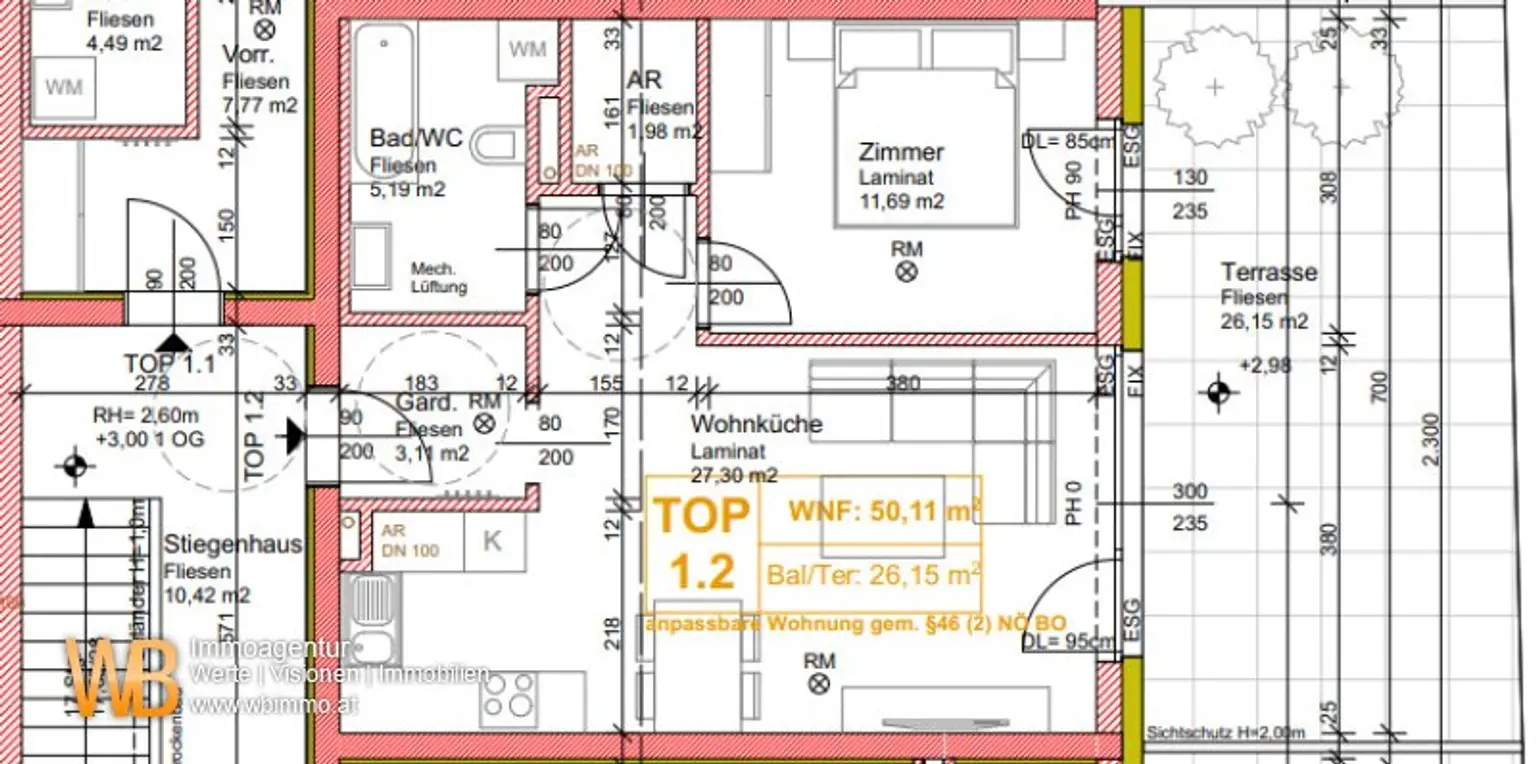 TOP 1.2 mit 50,11m² und 26,15m² Terrasse € 256.000.-
