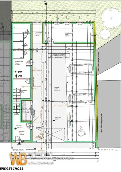 Zufahrt und Hof Die Zugangsflächen zu Hauseingängen und die Stellplätze für PKW werden in Asphalt oder geschliefenem Beton ausgeführt. Rasenflächen werden begrünt.