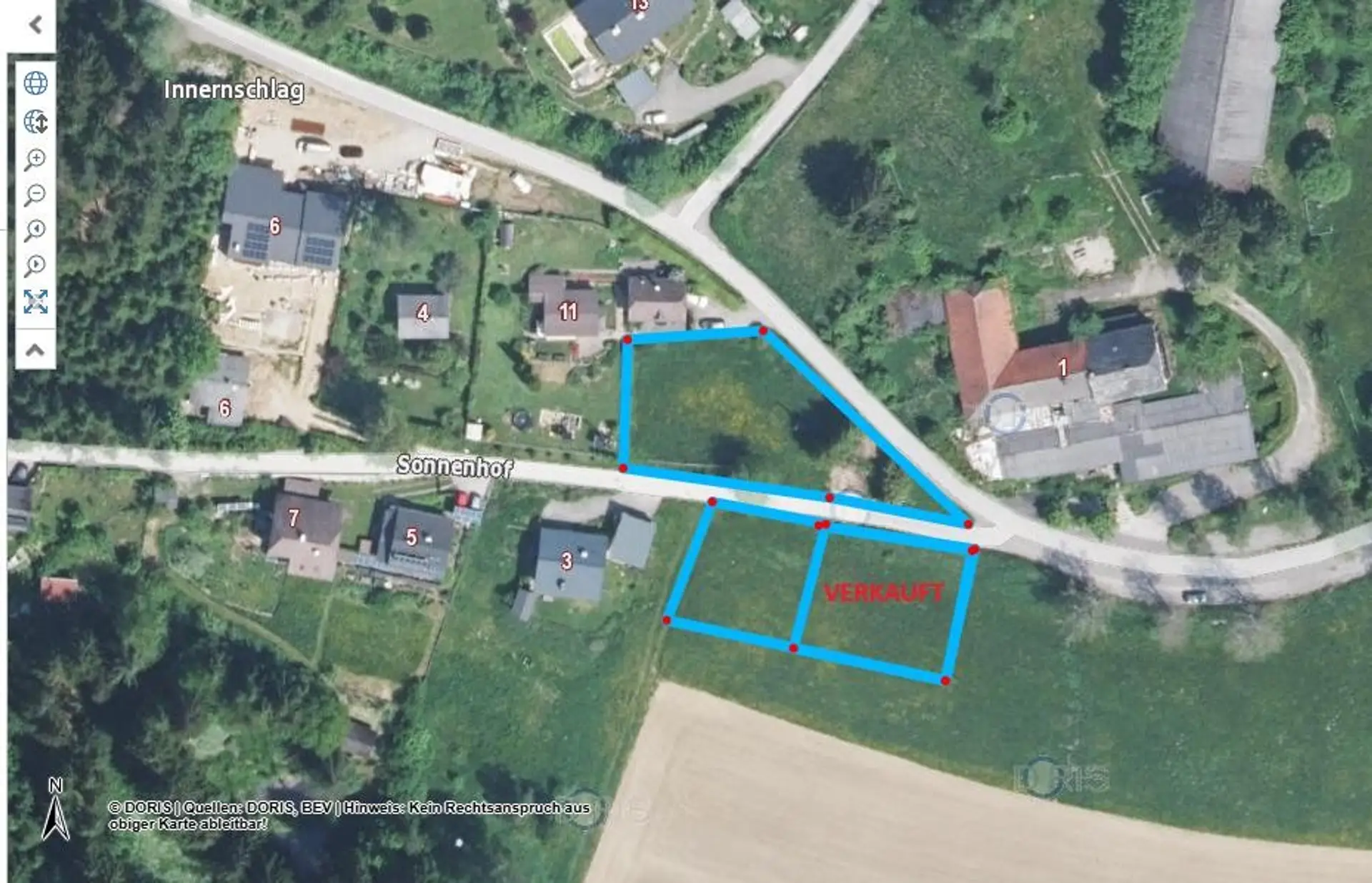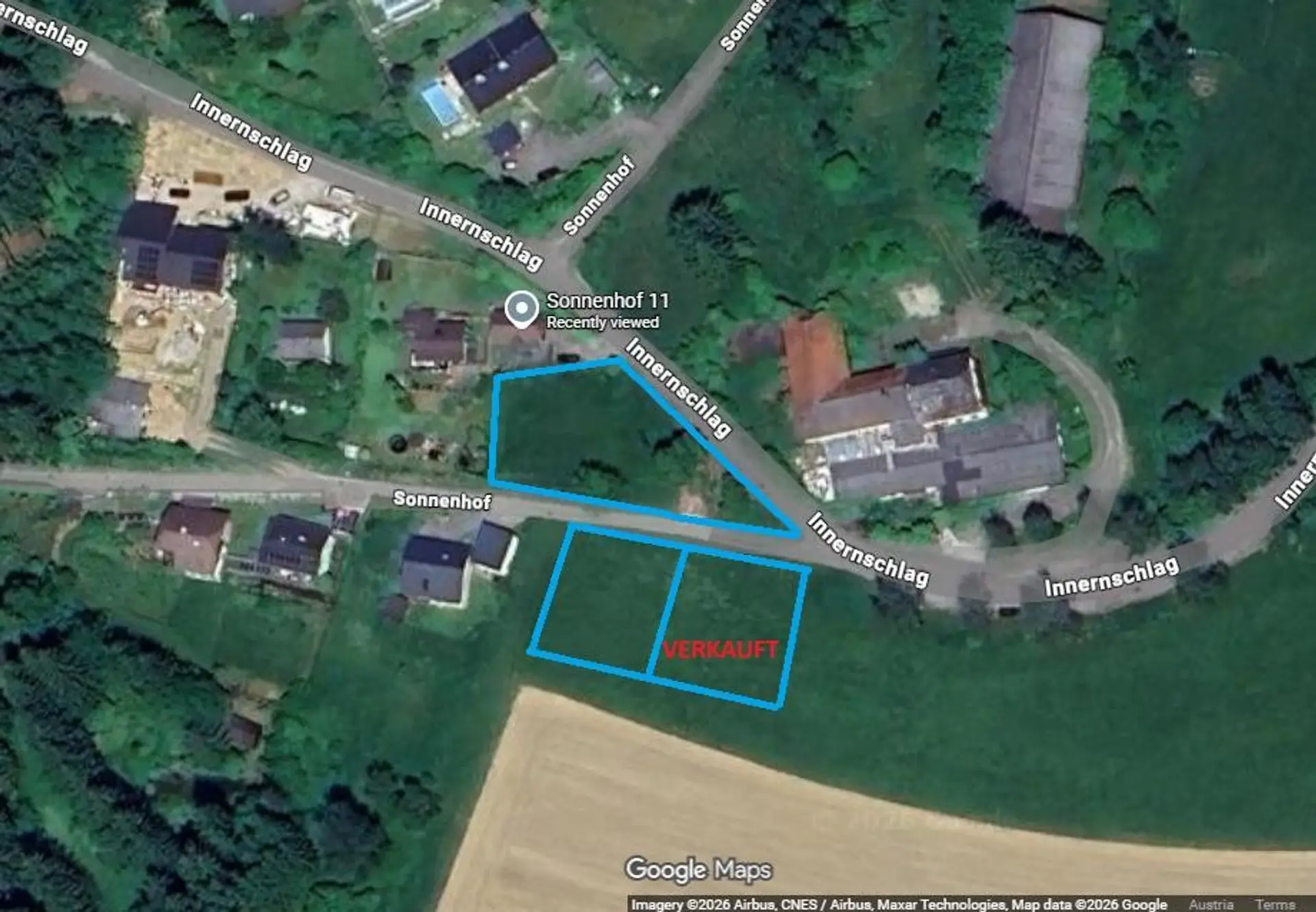 Die Gründe liegen links und vor dem ehemaligen Gasthaus/Pension SONNENHOF in Innerschlag. Bauzwang binnen 4 Jahren.