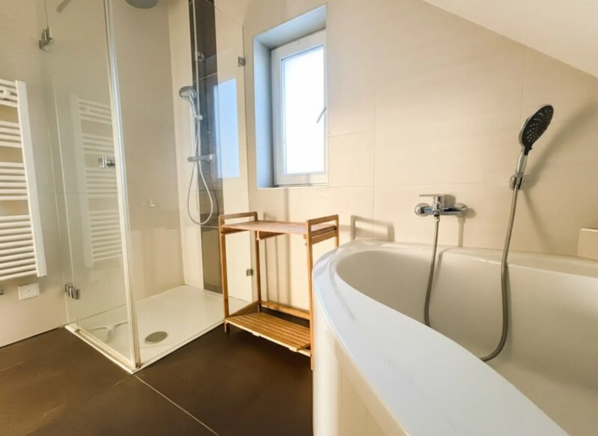 * Helles Badezimmer mit Tageslicht, Dusche und Eckbadewanne