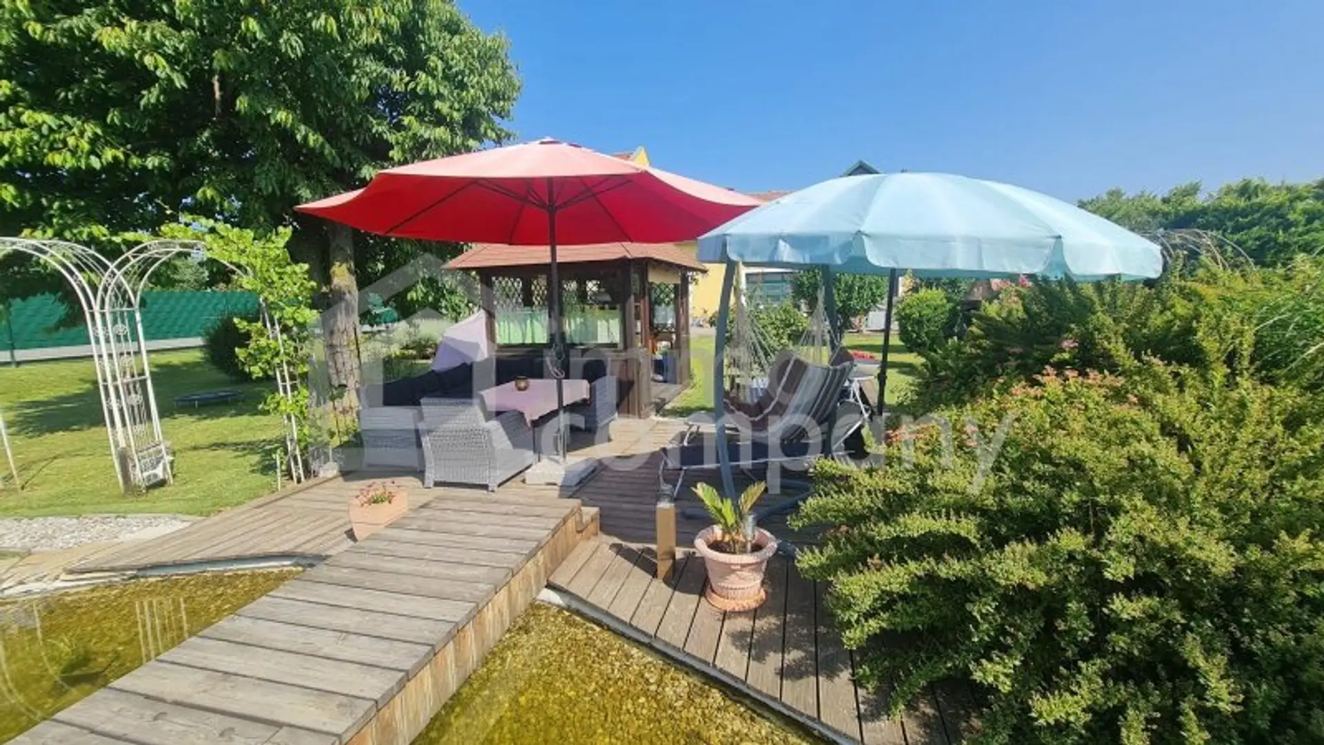 Ein einladender Pool sorgt an warmen Tagen für Abkühlung, während der beeindruckende Naturteich mit elektrisch steuerbarem Wasserfall ein besonderes Highlight darstellt. In der Mitte des Teichs befindet sich eine kleine Insel, die dem Garten eine außergewöhnliche Atmosphäre verleiht.