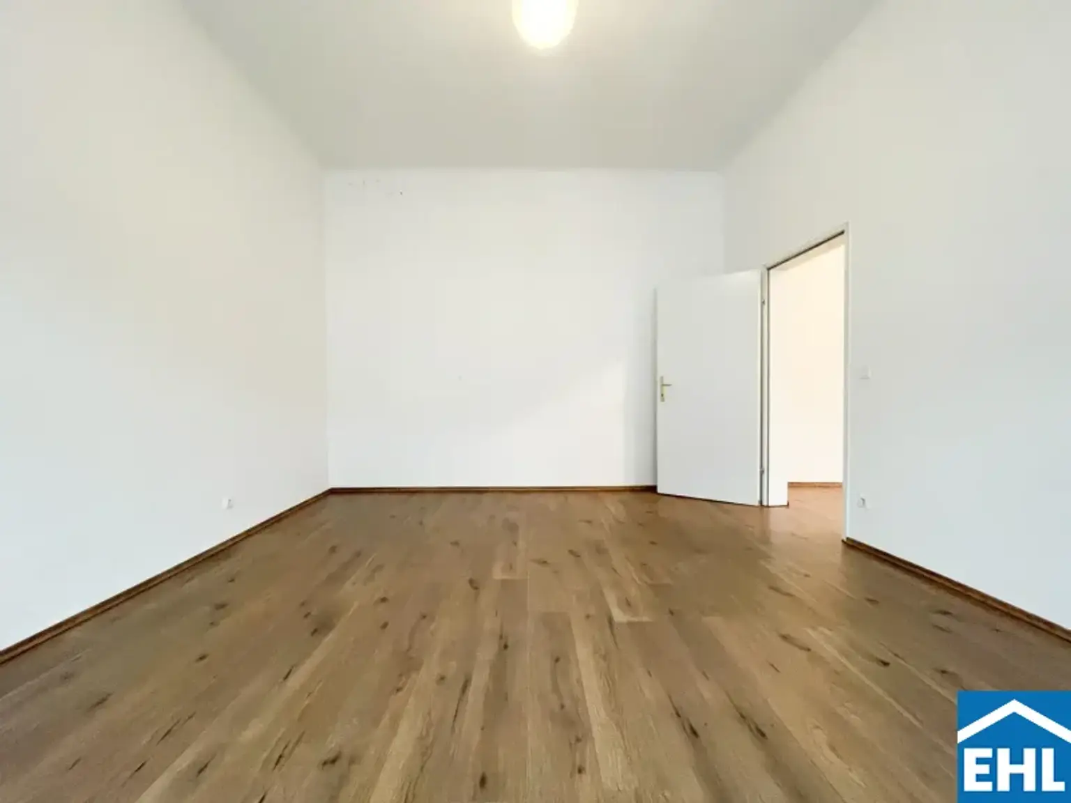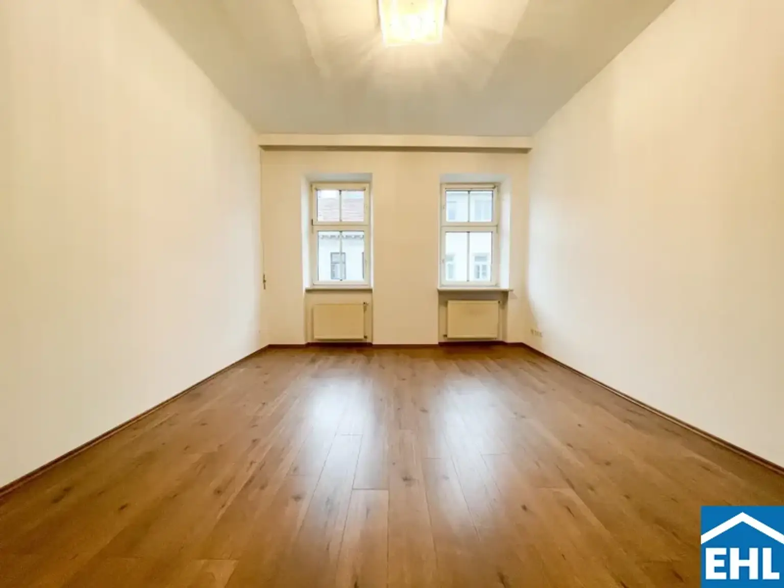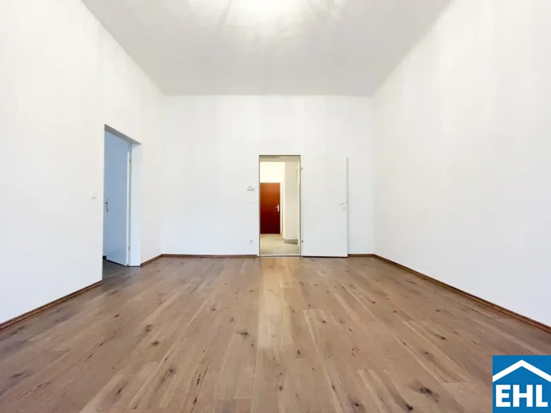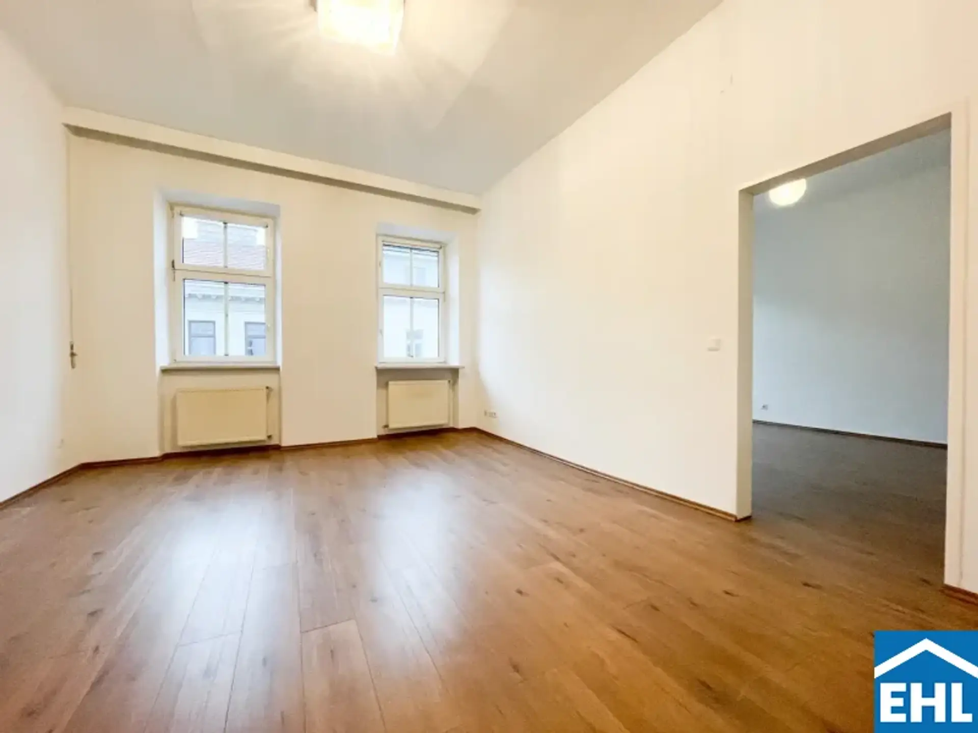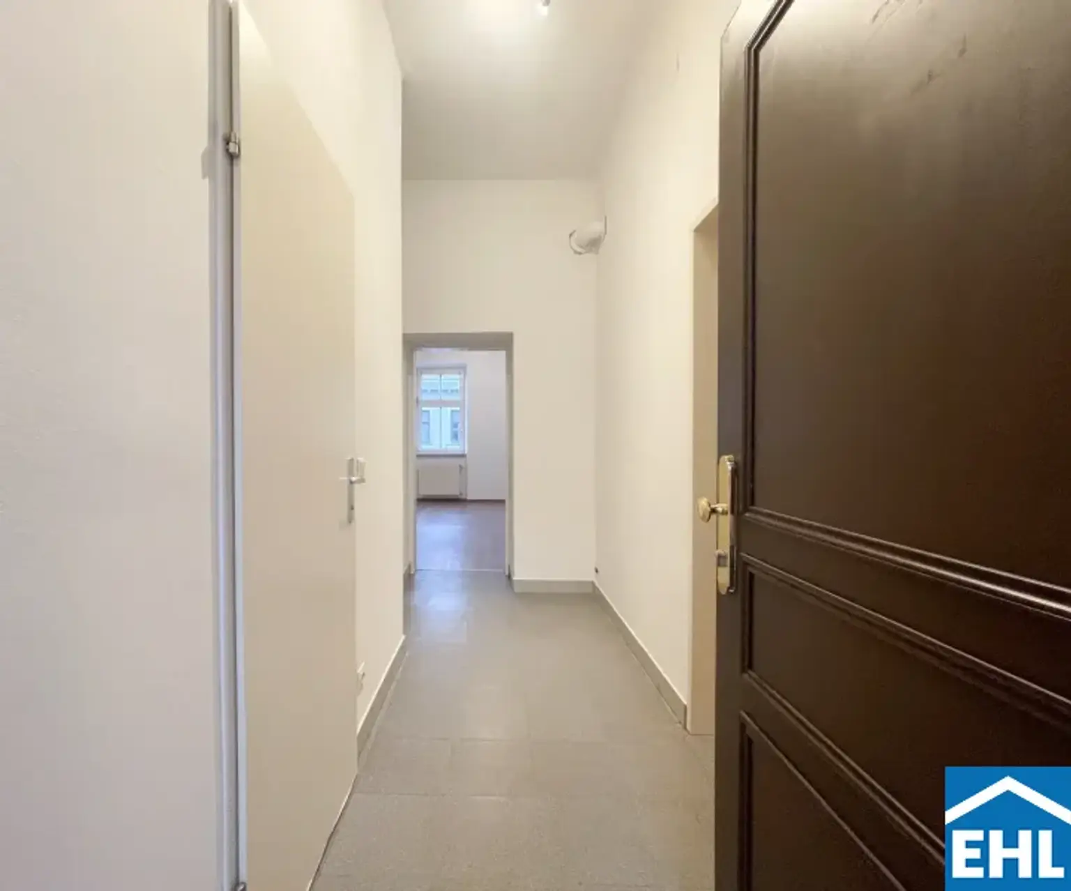 Die Wohnung selbst bietet eine praktische Raumaufteilung mit Vorraum, separater Küche, Wohnzimmer, einem Schlafzimmer sowie Badezimmer. Die beiden Zimmer sind mit jeweils etwa 20m² sehr großzügig geschnitten und bieten so viel Gestaltungsfreiraum.
