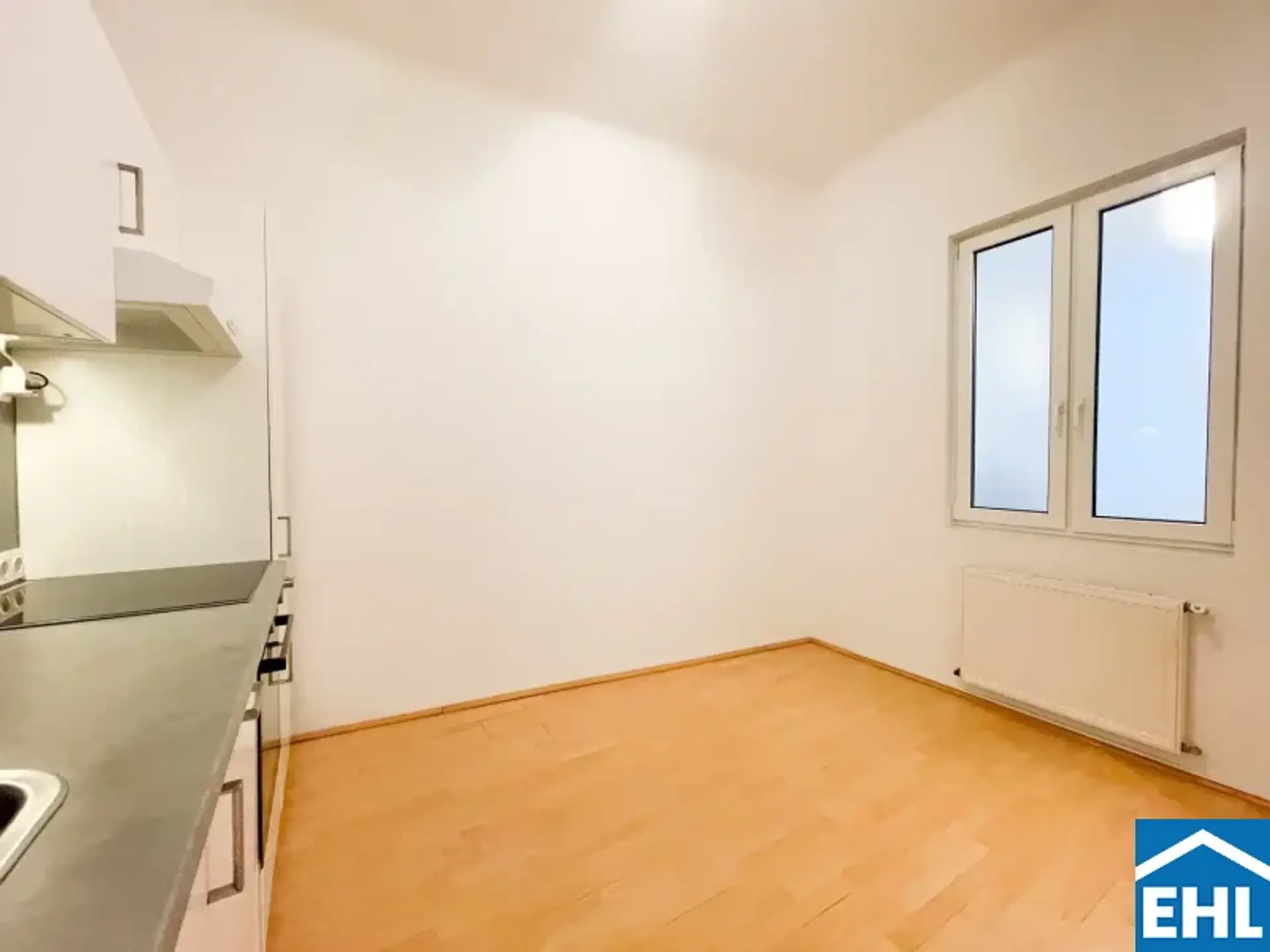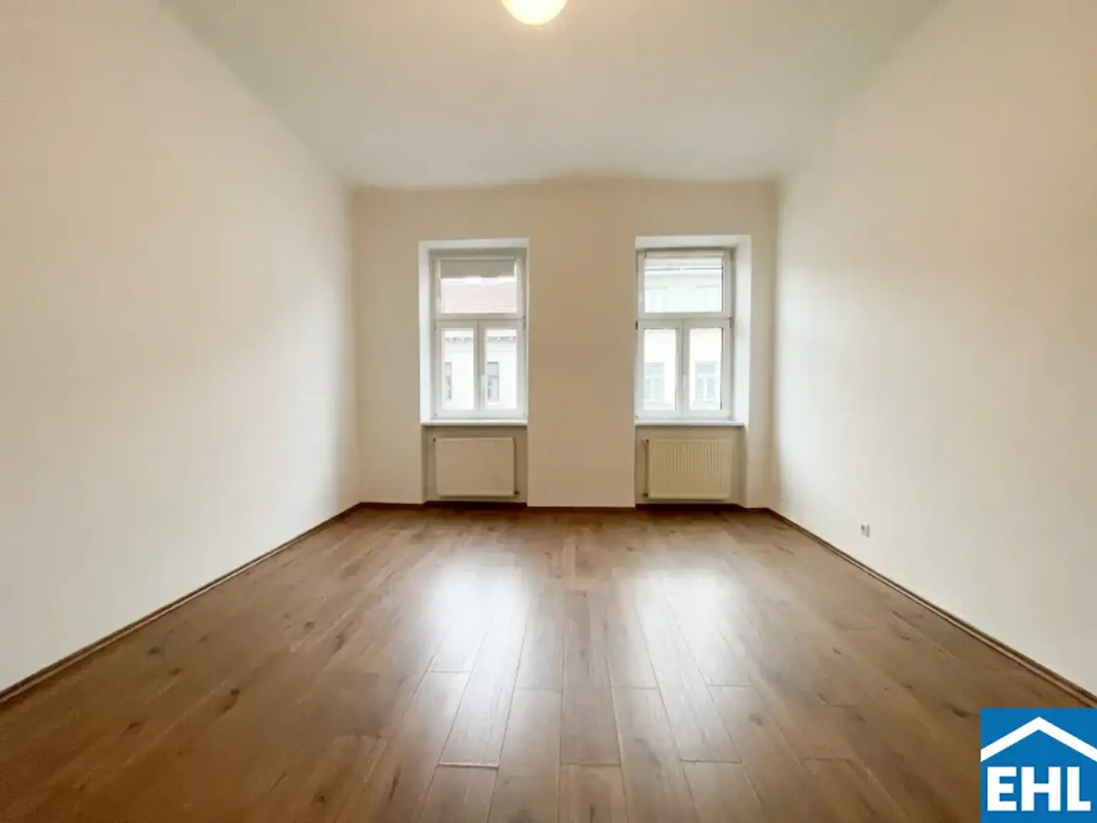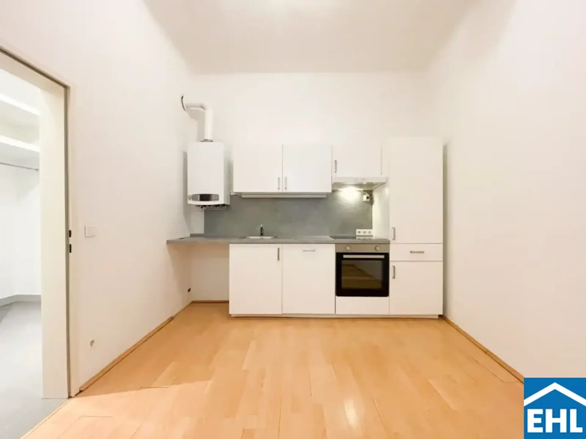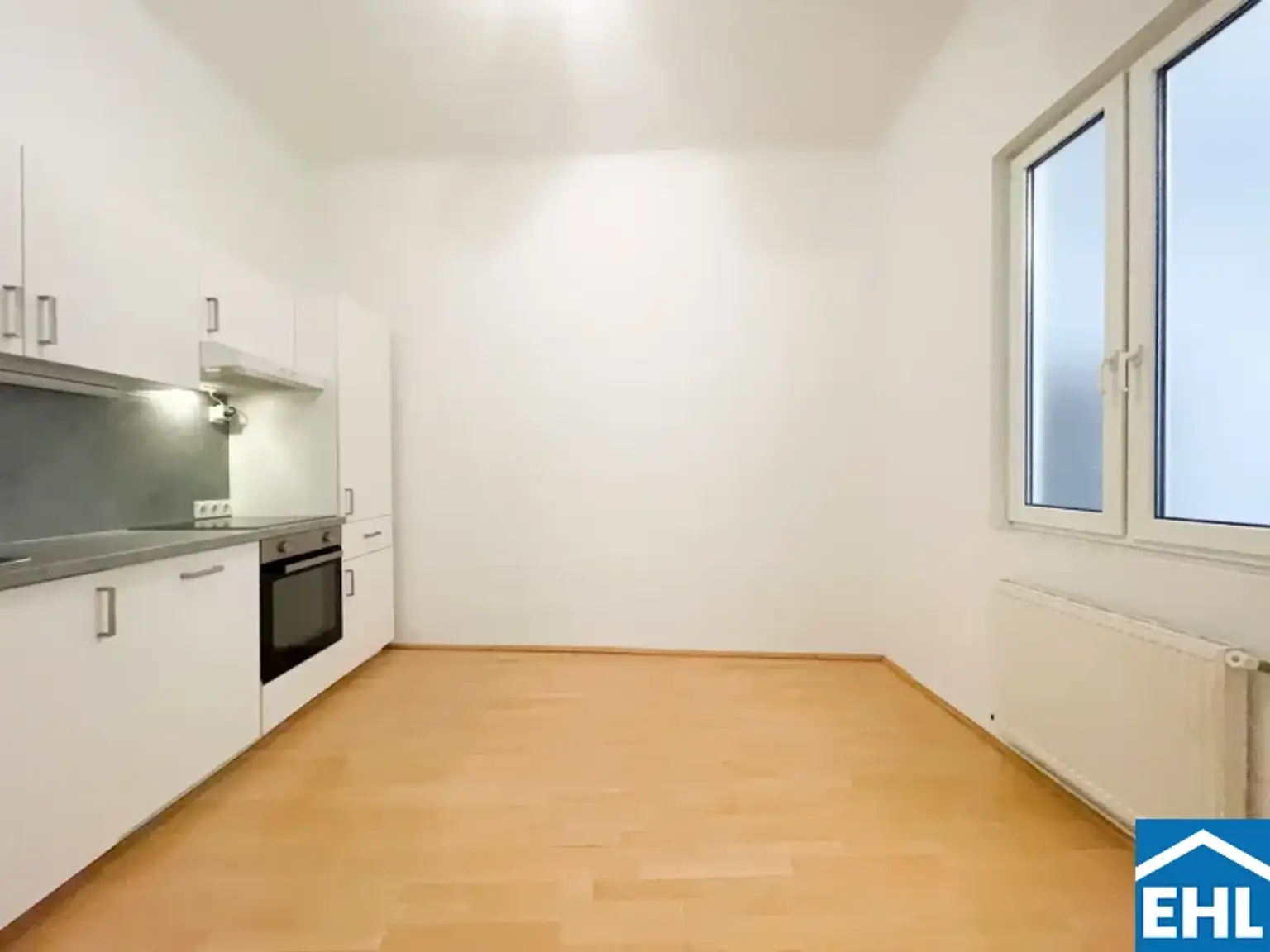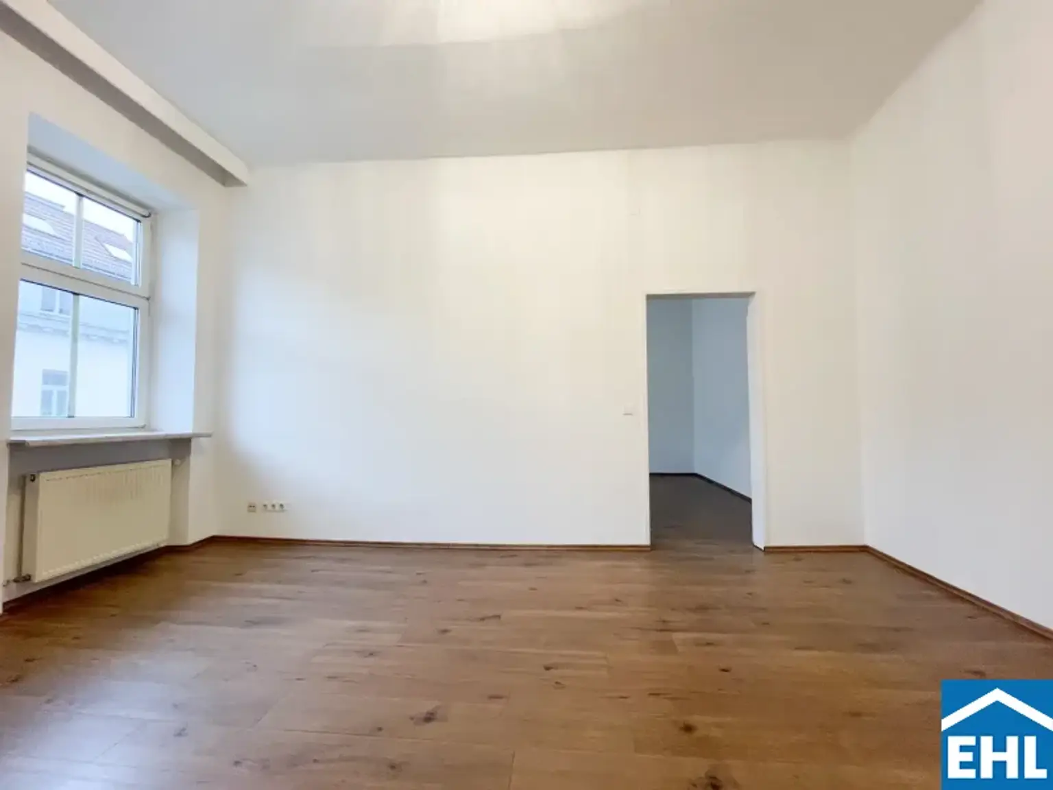 Die Wohnung selbst bietet eine praktische Raumaufteilung mit Vorraum, separater Küche, Wohnzimmer, einem Schlafzimmer sowie Badezimmer. Die beiden Zimmer sind mit jeweils etwa 20m² sehr großzügig geschnitten und bieten so viel Gestaltungsfreiraum.