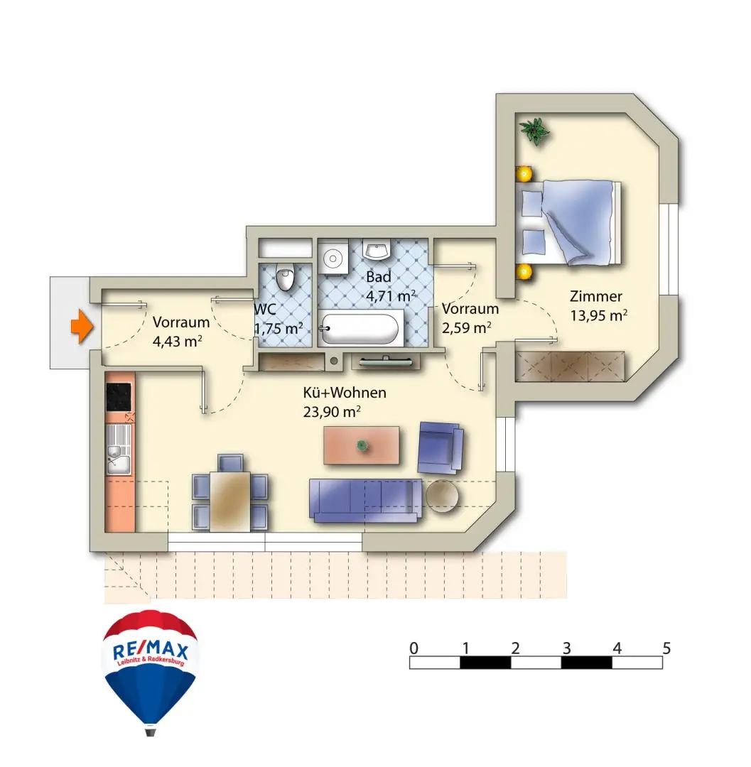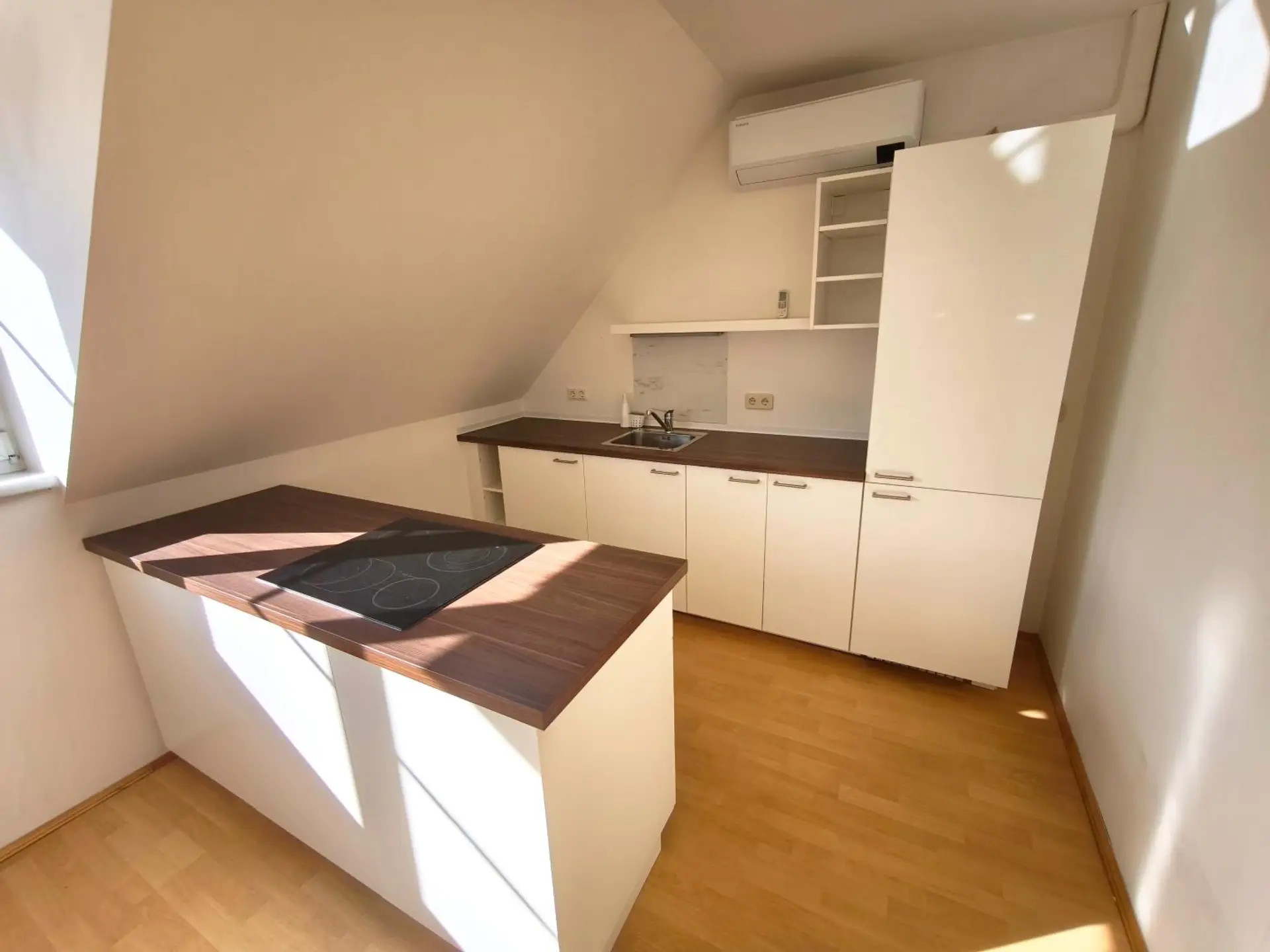 Die Raumaufteilung wirkt durchdacht und funktional: Ein separates WC, ein Badezimmer mit Badewanne sowie ein gut integrierter Koch/Wohn/Essbereich mit Küchenzeile und Insel schaffen ein wohnliches Gesamtgefühl. Das Schlafzimmer verfügt über einen französischen Balkon und bietet damit ein kleines Plus an Offenheit und Atmosphäre. Weiters ist auch eine Samsung Split Klimaanlage installiert.