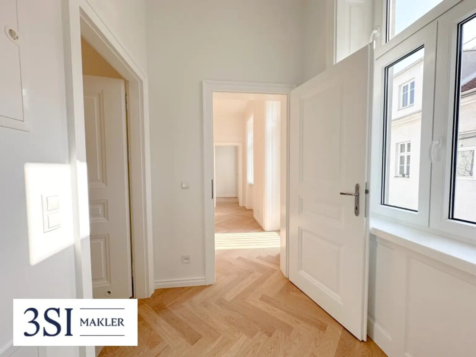 Das Haus umfasst drei elegante Regelgeschoße – aktuell noch ohne Personenlift, dafür mit umso mehr Charakter.