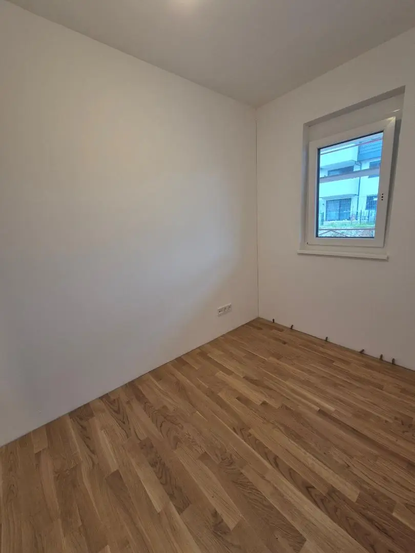 Vorraum, Badezimmer mit Dusche, WC und Waschmaschinen Anschuss, Abstellraum, Wohnraum mit Küche und Schlafzimmer, 14 m² Garten inkl. Terrasse.