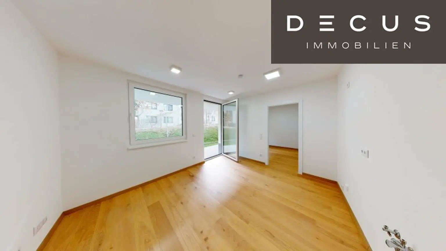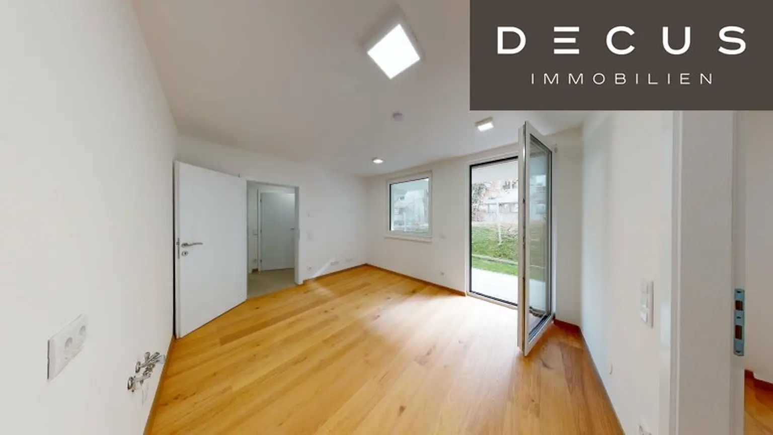 Die helle Neubauwohnung liegt im Erdgeschoss mit einem kleinen eingezäunten Garten in einer ruhigen Sackgasse.