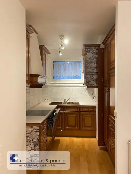 Mit dem Lift kommt man in ein freundliches offenes Stiegenhaus . Ein zentrales Vorzimmer mit Garderobe ist das Willkommen dieser hübschen Wohnung. Das Badezimmer mit Dusche , Doppelwaschbecken und Teilmöblierung mit Fenster ist linker Hand . Das Wohnzimmer mit Ausgang auf den überdachten Balkon ist geräumig und mit Parkett. ,abgetrennt ist die Tischlerküche mit einer grossen Arbeitsftfläche Fenster und allen Geräten .Das Schlafzimmer ist mit einem eleganten Kasten ,einem Fenster auf den Balkon und eine absolute Ruheoase. Der Waschmaschinen anschluss ist in einem kleinen Seitenraum. Gegenüber der Wohnung ist ein ca. 4m² grosser trockener Lager und Abstellraum.