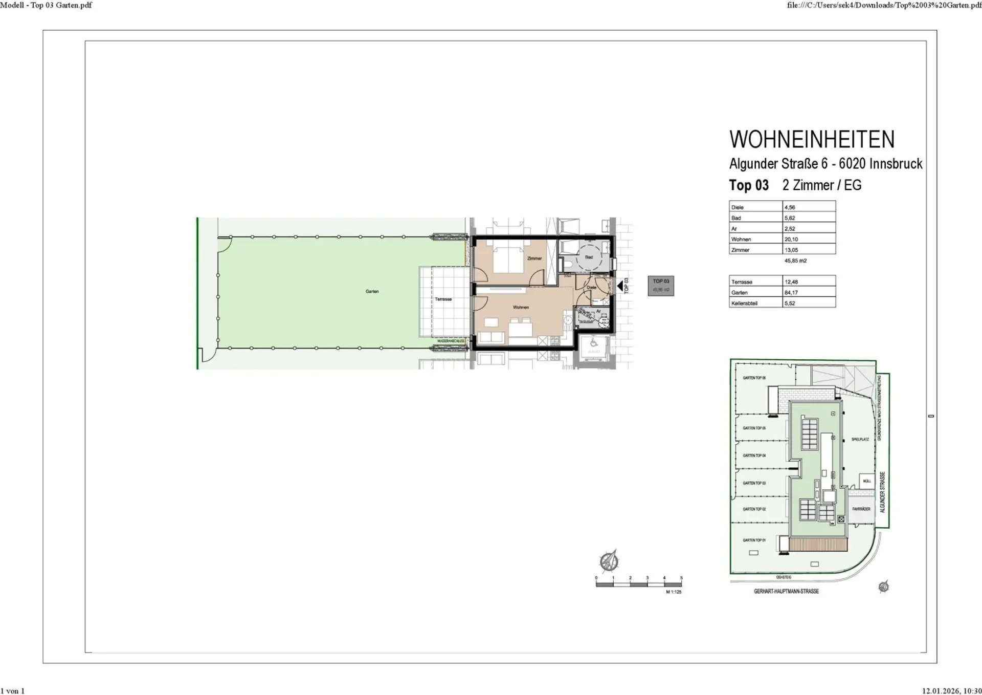 Die gegenständliche 2-Zimmer-Wohnung befindet sich im Erdgeschoß. Sie verfügt über eine Wohnfläche von ca. 45,85 m² und einer Freifläche von ca. 96,65 m²