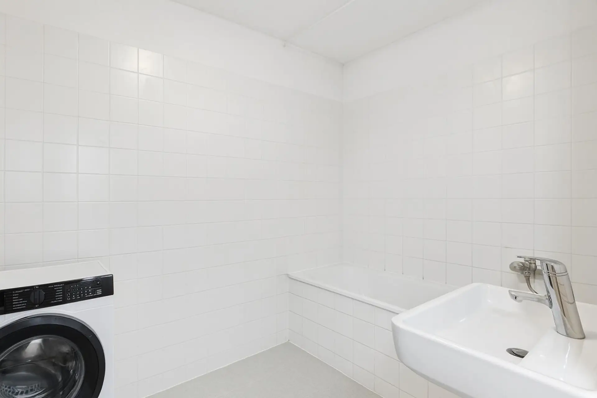 • Badezimmer mit Badewanne, Waschbecken und Waschmaschinenanschluss