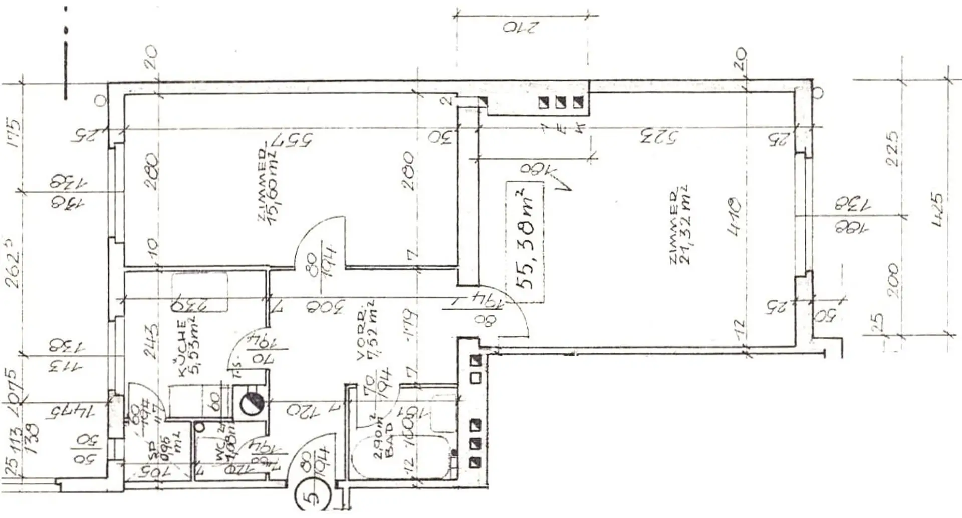 Aus dem zentralen Vorraum gelangen Sie in das ca. 21 m² große Wohnzimmer, das ca. 16 m² große, hofseitige Schlafzimmer, die hofseitige Küche mit Abstellraum/Speis sowie das Bad und das separate WC.