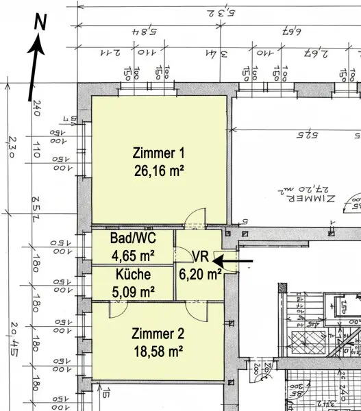 Zentraler Vorraum mit Zugang zu allen Räumen (Küche über Zimmer 2 erreichbar)