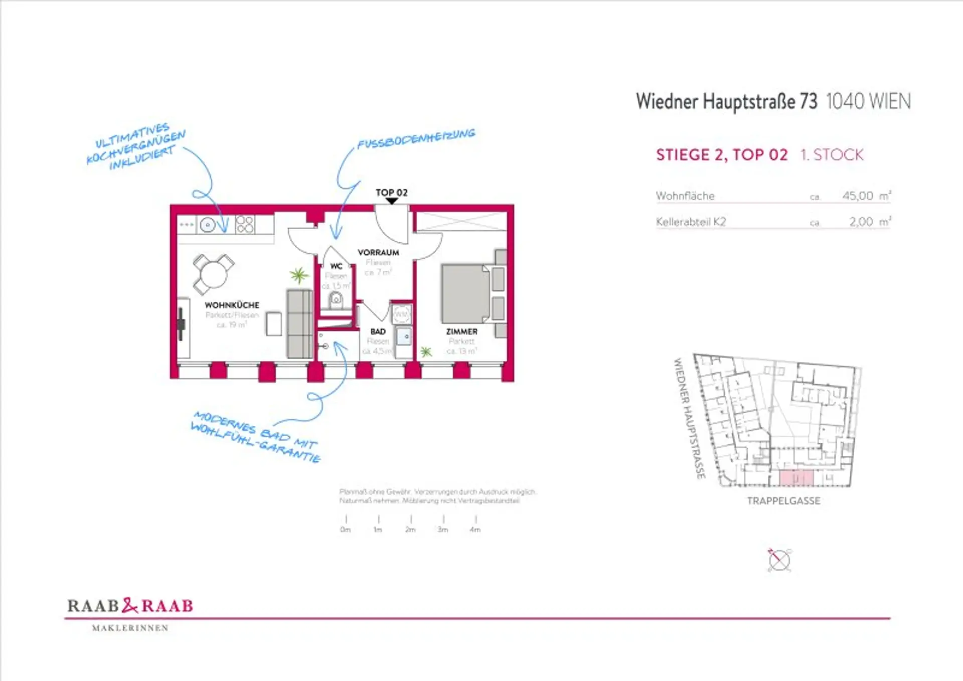 Die Eckdaten der Wohnung, welche im 1. Stock liegt, sind wie folgt: