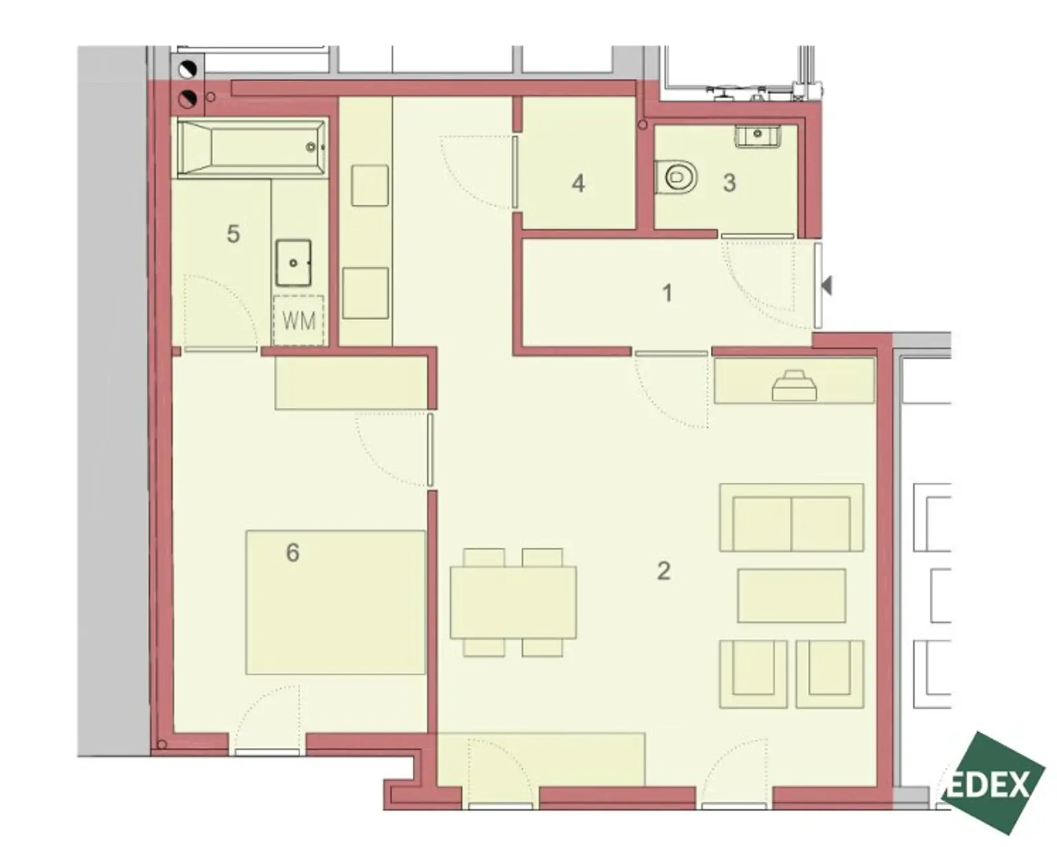 Die Wohnung verfügt über ein Wohnzimmer mit ausgestatteter Küche und ein Schlafzimmer das vom Wohnzimmer aus erreichbar ist und direkten Zugang zum Badezimmer hat, welches mit Badewanne und Doppelwaschbecken, Handtuchheizkörper und Waschmaschinen-Anschluss ausgestattet ist. Ein separater Abstellraum bietet zusätzlichen, praktischen Stauraum. Das WC ist separat ausgeführt, vom Vorraum begehbar und mit Handwaschbecken ausgestattet.