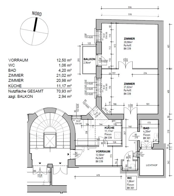 Vorraum, 2 Zimmer, Küche, Bad, separates WC, Balkon ca. 3 m²