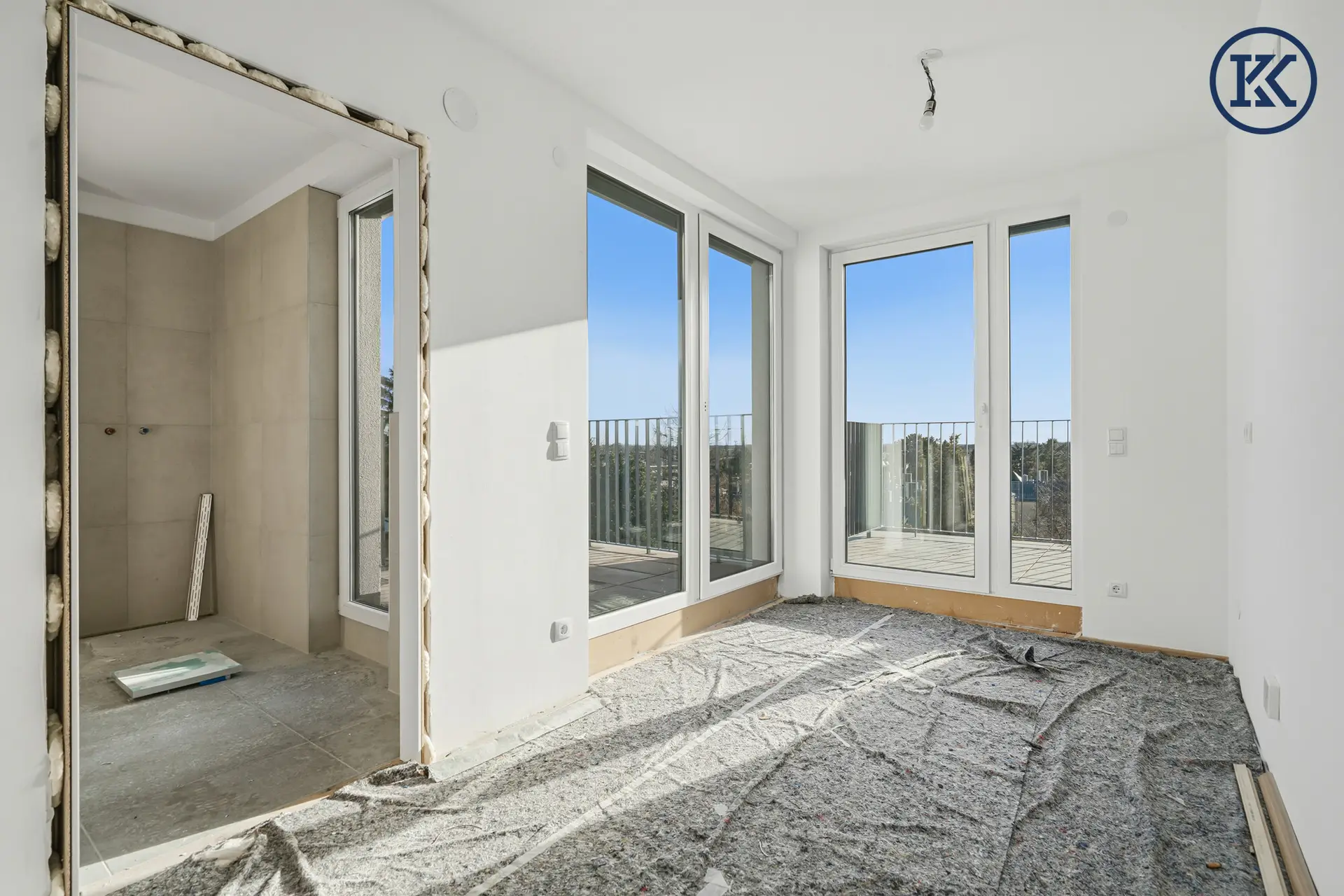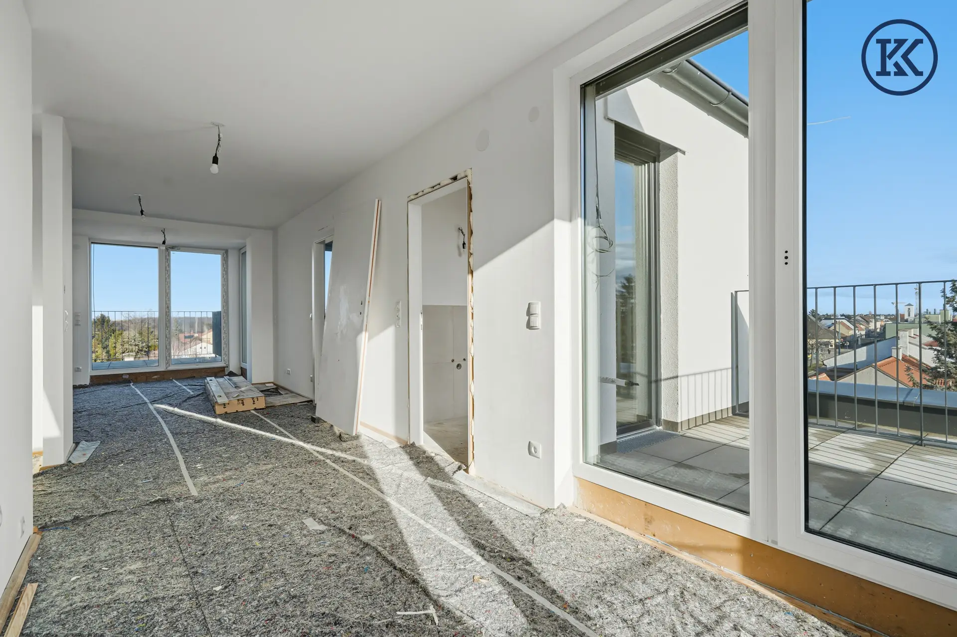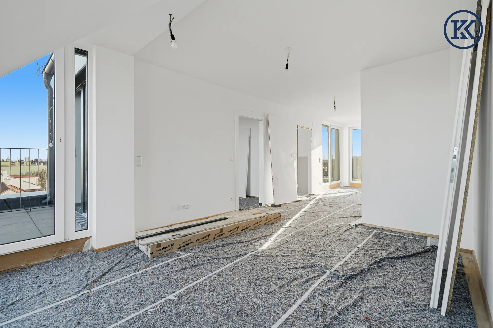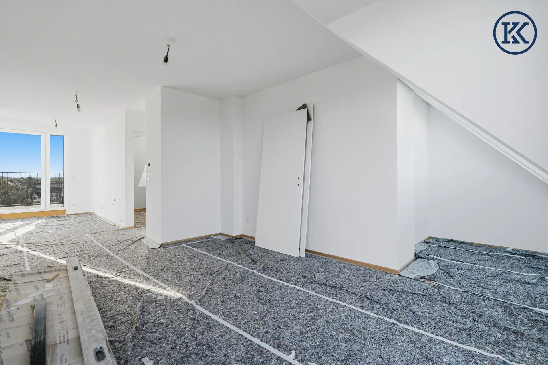 Diese Wohnung ist das Kronjuwel der Dachgeschosseinheiten: Sie bietet im 2. Dachgeschoss ein unvergleichliches Wohngefühl. Die Wohnfläche beträgt 56,68 m², doch das wahre Erlebnis ist die sensationelle, 23,75 m² große Dachterrasse. Diese riesige Freifläche bietet maximale Privatsphäre, Platz für große Gartenmöbel und einen fantastischen Blick – echtes Penthouse-Feeling inklusive! Der Grundriss ist optimal auf zwei Zimmer ausgelegt und maximiert die Lichtausbeute. Zur Premium-Ausstattung im Neubau gehören eine energiesparende Fußbodenheizung und eine Klimavorbereitung. Durch die Lage im obersten Geschoss und die exklusive Terrassengröße ist diese Immobilie ein einzigartiges Angebot in Eßling. Sichern Sie sich diesen außergewöhnlichen Erstbezug ab Anfang Februar 2026.