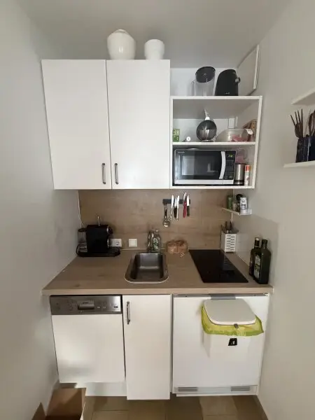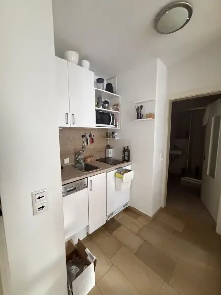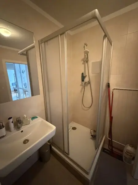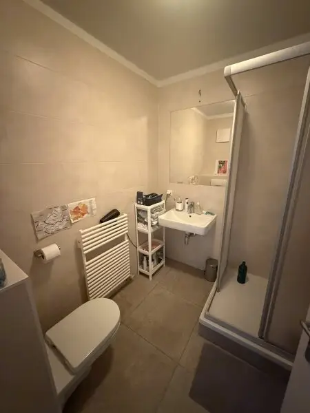 Der mit Steinboden ausgestattete Vorraum führt in die knapp 42 m² große Unterkunft welche genügend Platz mit insgesamt 2 Zimmern und einer gemütlichen Küche inkl. Geräten des täglichen Bedarfs bietet. Im Badezimmer befindet sich auf modernen, grauen Fliesen eine Dusche, ein Waschbecken, ein Handtuchheizkörper und ein WC.