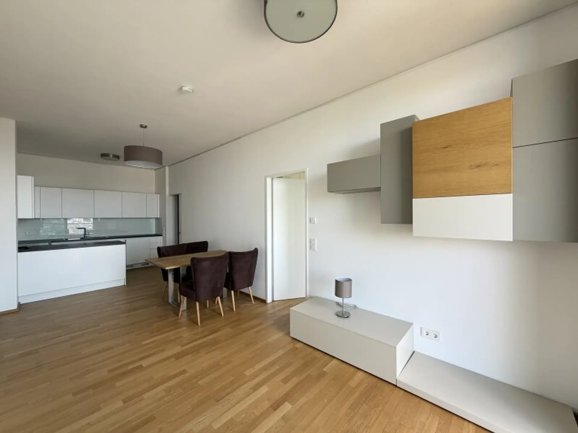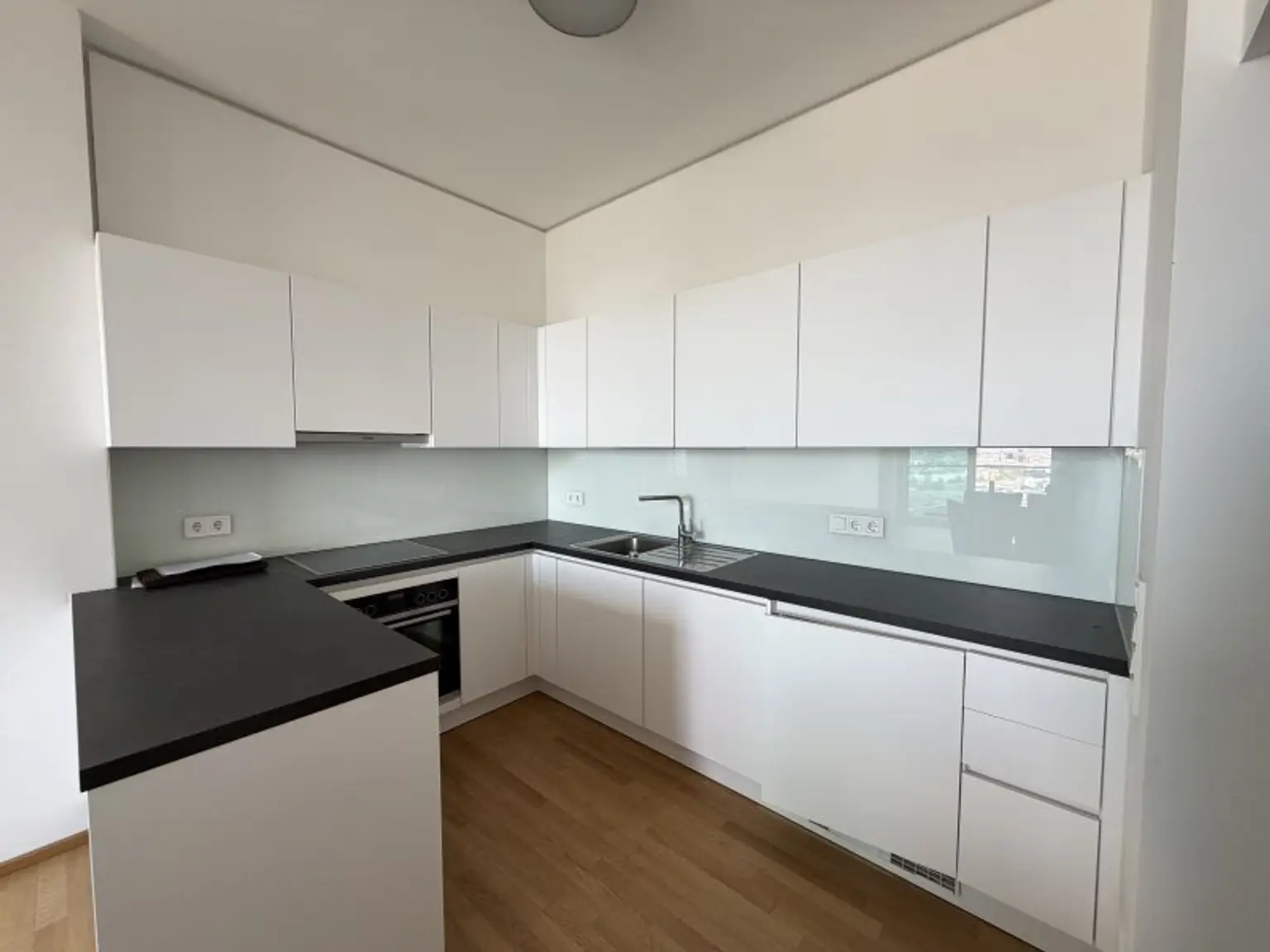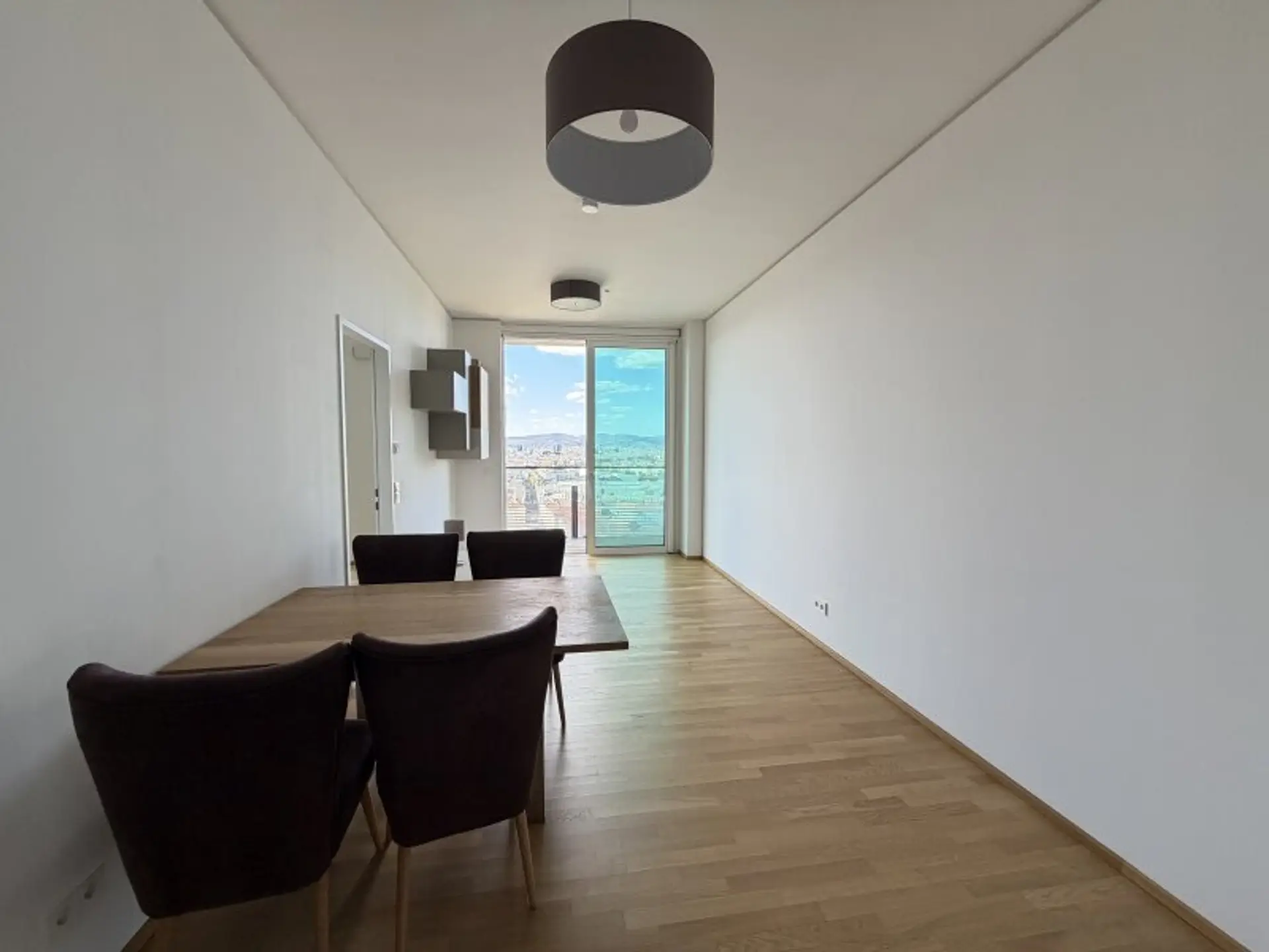 Die Wohnung ist eingeteilt in eine offene Wohnküche mit großer Balkontür und freiem Blick auf ganz Wien und einem Schlafzimmer ebenfalls mit Zugang zum Balkon und einem Einbauwandschrank. Die Wohnung verfügt über ein Badezimmer mit WC und einer Badewanne. Zusätzlich gibt es einen separaten Abstellraum, der praktischen Stauraum bietet.