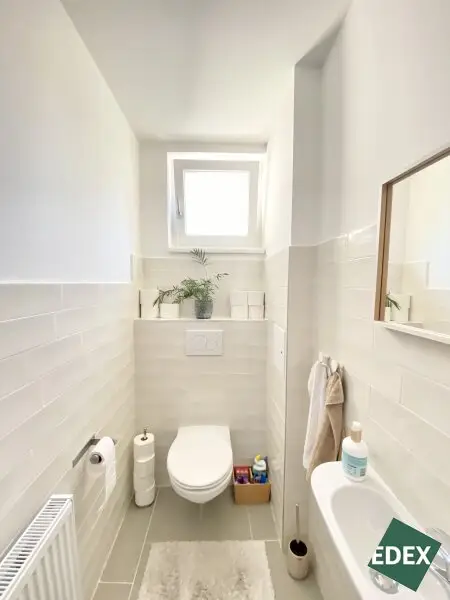 * Badezimmer mit Dusche, Waschbecken, Waschmaschinen-Anschluss und Fenster