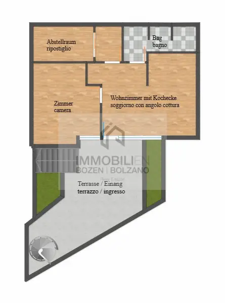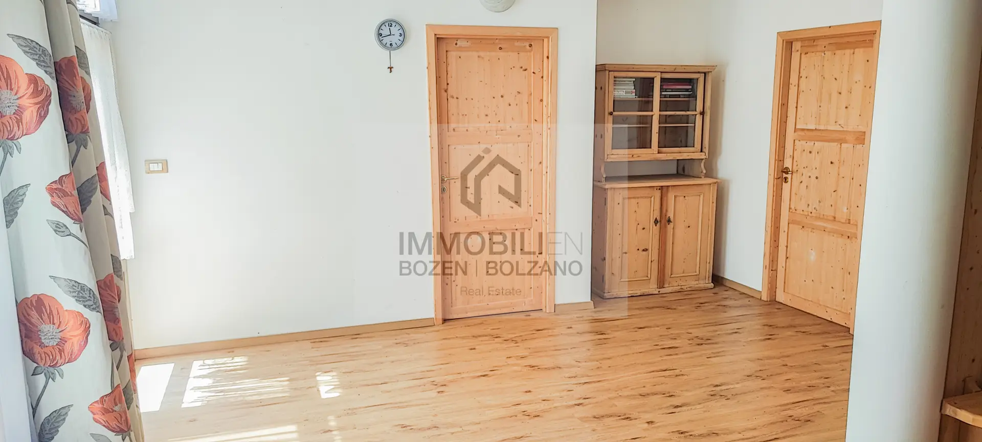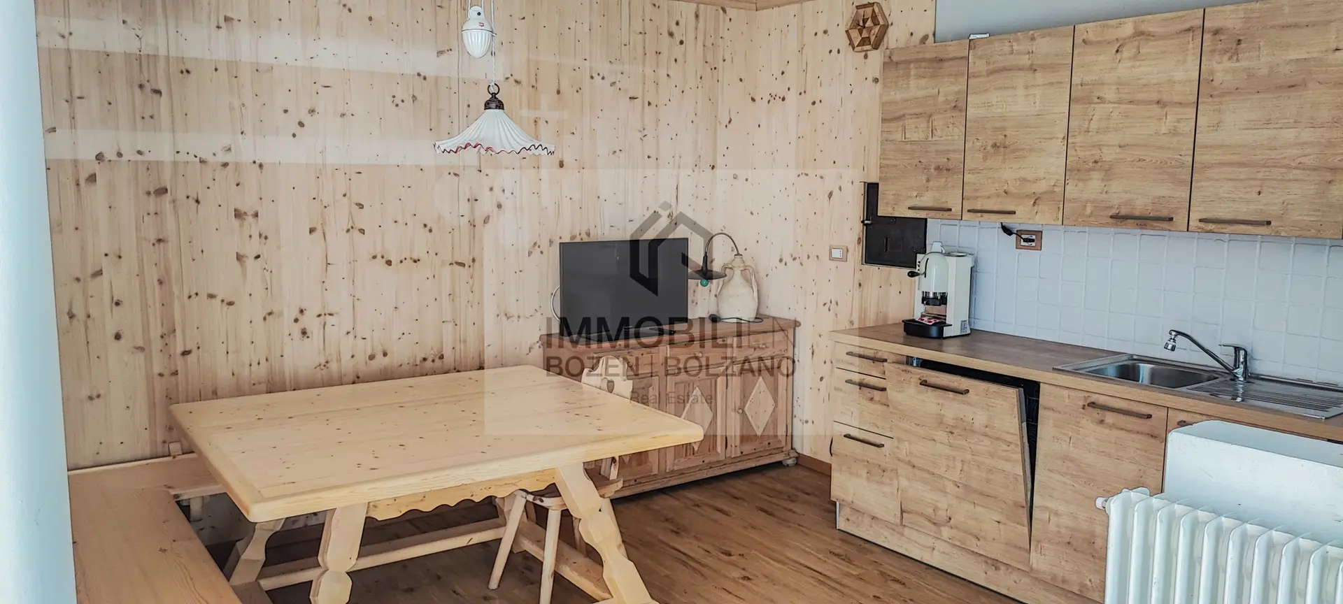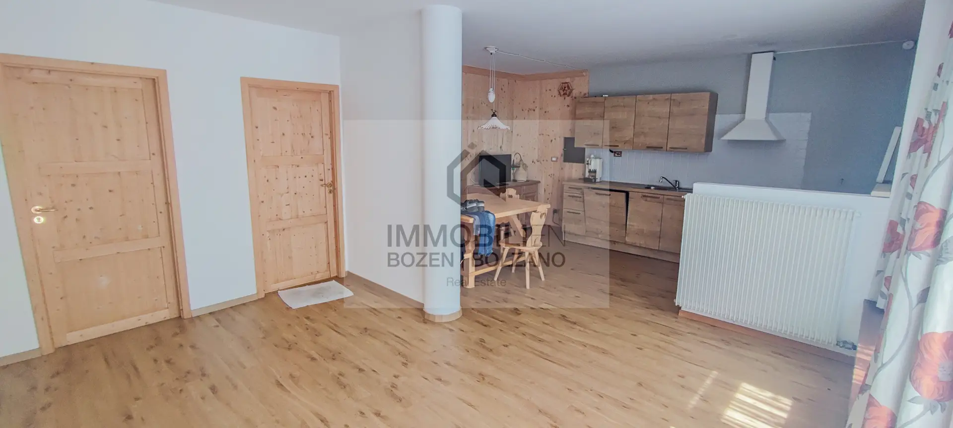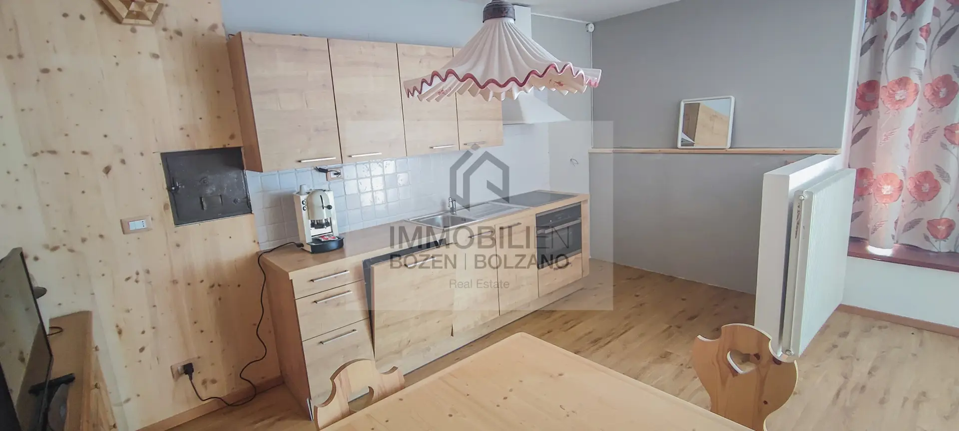 Vom ca. 30 qm großen, sehr sonnigen Außenbereich gelangt man in eine Eingangshalle, rechts davon in einen angenehmen Wohnbereich mit einem gut verglasten Wohnzimmer, einer Stube mit Holzbank und -tisch und einer Kochnische; die Eingangshalle auf der linken Seite führt zu einem großen Schlafzimmer, ebenfalls aus Holz, zwei Abstellräumen und einem geräumigen Bad mit Duschecke und Waschmaschine. Im Preis inbegriffen ist ein Außenstellplatz. Die Wohnung wurde 2019 komplett renoviert, sowohl in der Einrichtung als auch in der Anlagentechnik. Die Heizung ist zentralisiert mit unabhängiger Regulierung mittels eines Ölkessels. Verlegung des Wohnsitzes Pflicht. Die angegebenen Informationen sind indikativ und können Abänderungen unterliegen.