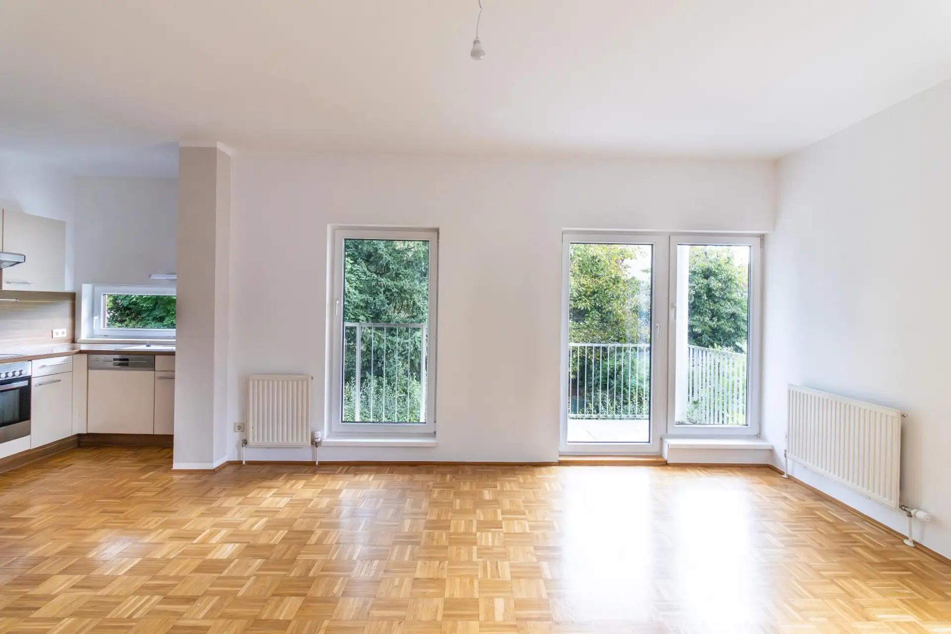 Die Wohnung gliedert sich in einen großen Wohn- und Essbereich (ca. 34 m²), in dem sich auch eine voll-ausgestattete Küche befindet, ein Schlafzimmer, ein Badezimmer mit Badewanne und Waschmaschinenanschluss, eine extra Toilette sowie ein geräumiges Vorzimmer.