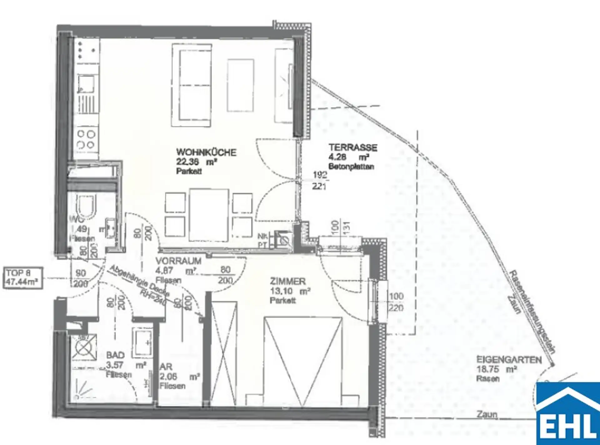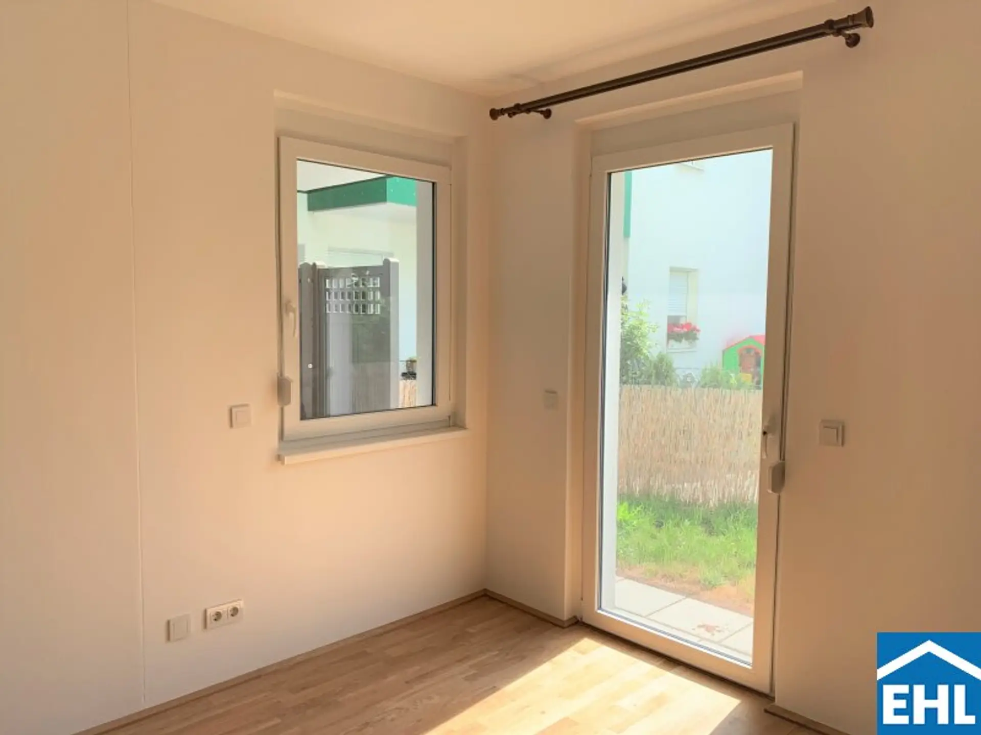 Die Wohnung selbst unterteilt sich in eine großzügige Wohnküche mit Küchenzeile, ein getrennt begehbares Schlafzimmer, ein Badezimmer mit Dusche und Waschmaschinenanschluss, eine separate Toilette, sowie einen Vor- und Abstellraum. Das Highlight der Wohnung ist der großzügige Eigengarten mit Terrasse!