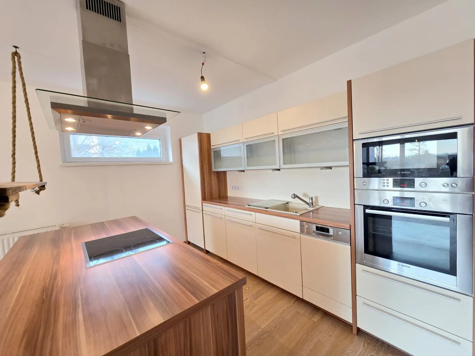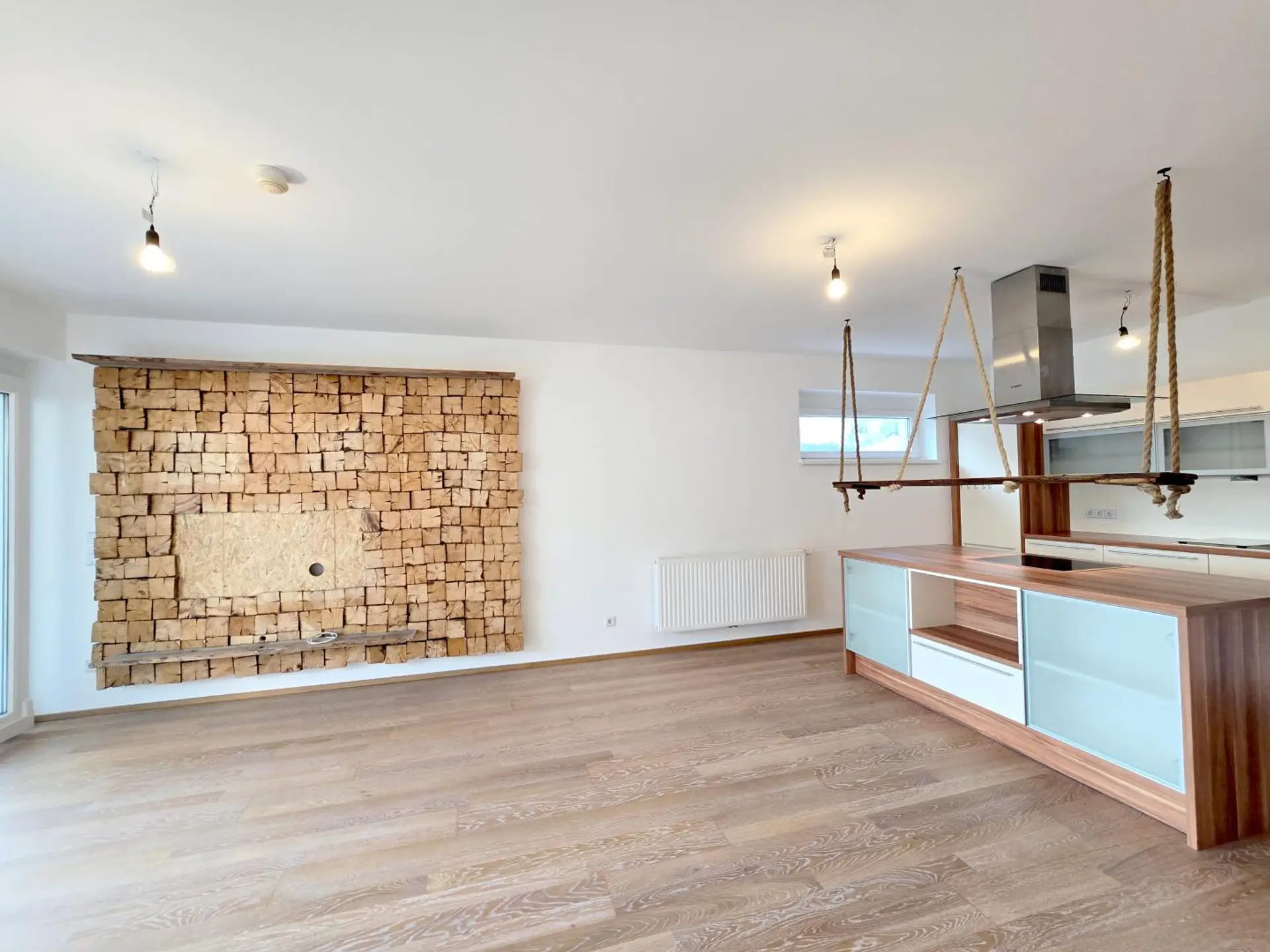 Ca. 75 m²: Geräumiges Wohnzimmer mit moderner Küche, 2 Schlaf-zimmer, geräumiges Bad mit Wanne, WC, Abstellraum, Vorzimmer