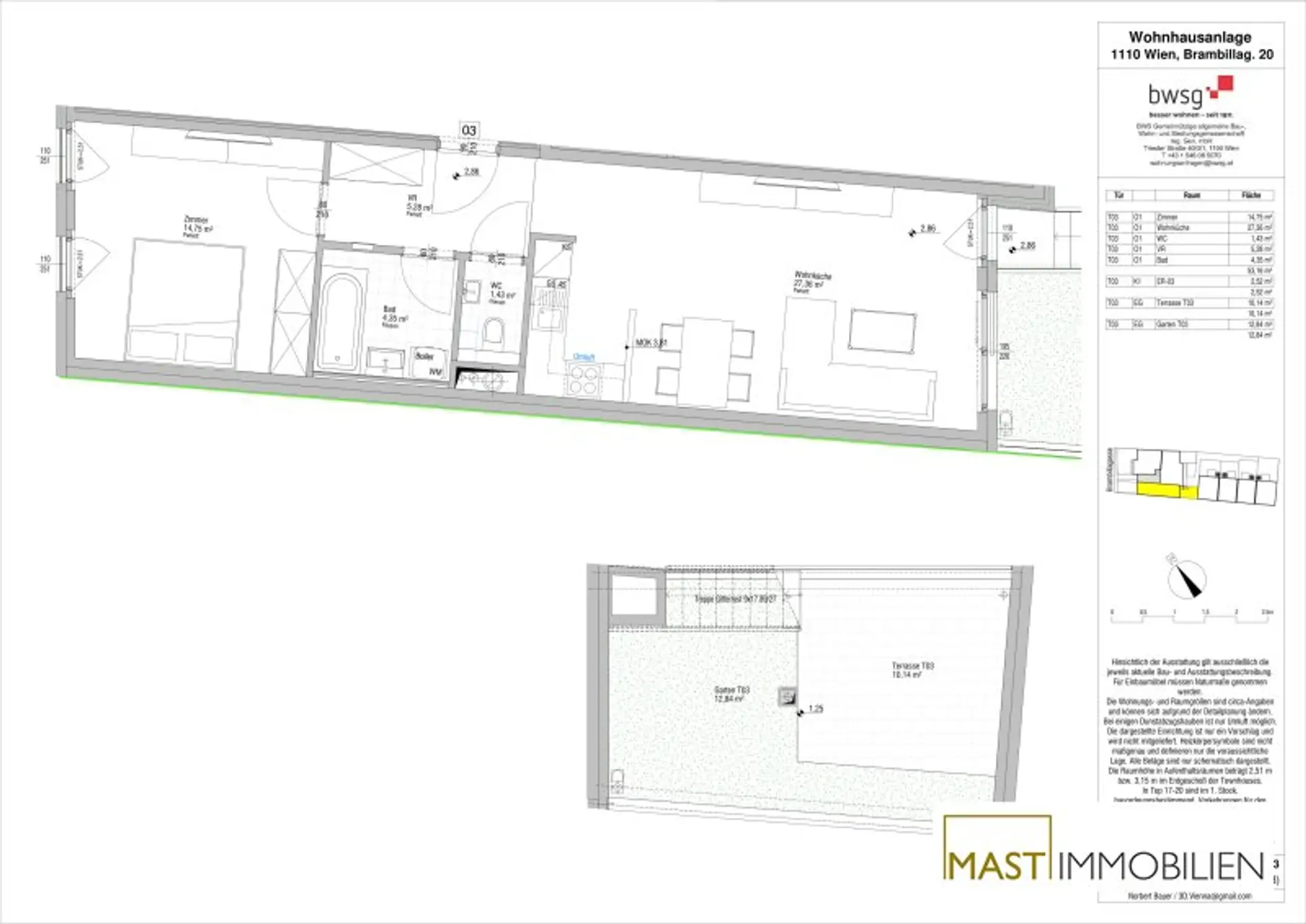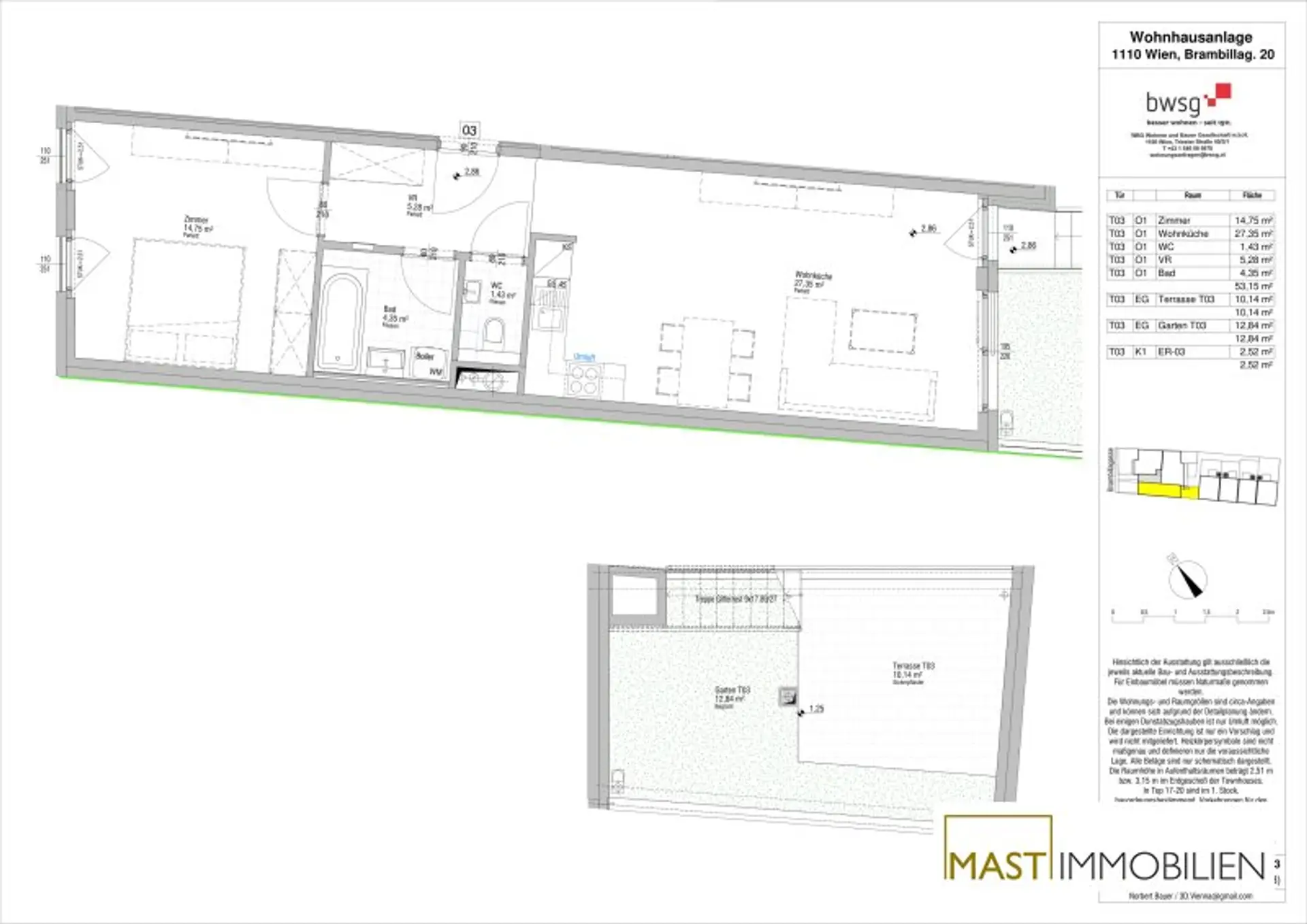 Die Wohnung befindet sich im Erdgeschoss und verfügt über 53,16 m² Wohnfläche + eine 22,98 m² große Terrasse/Garten.
