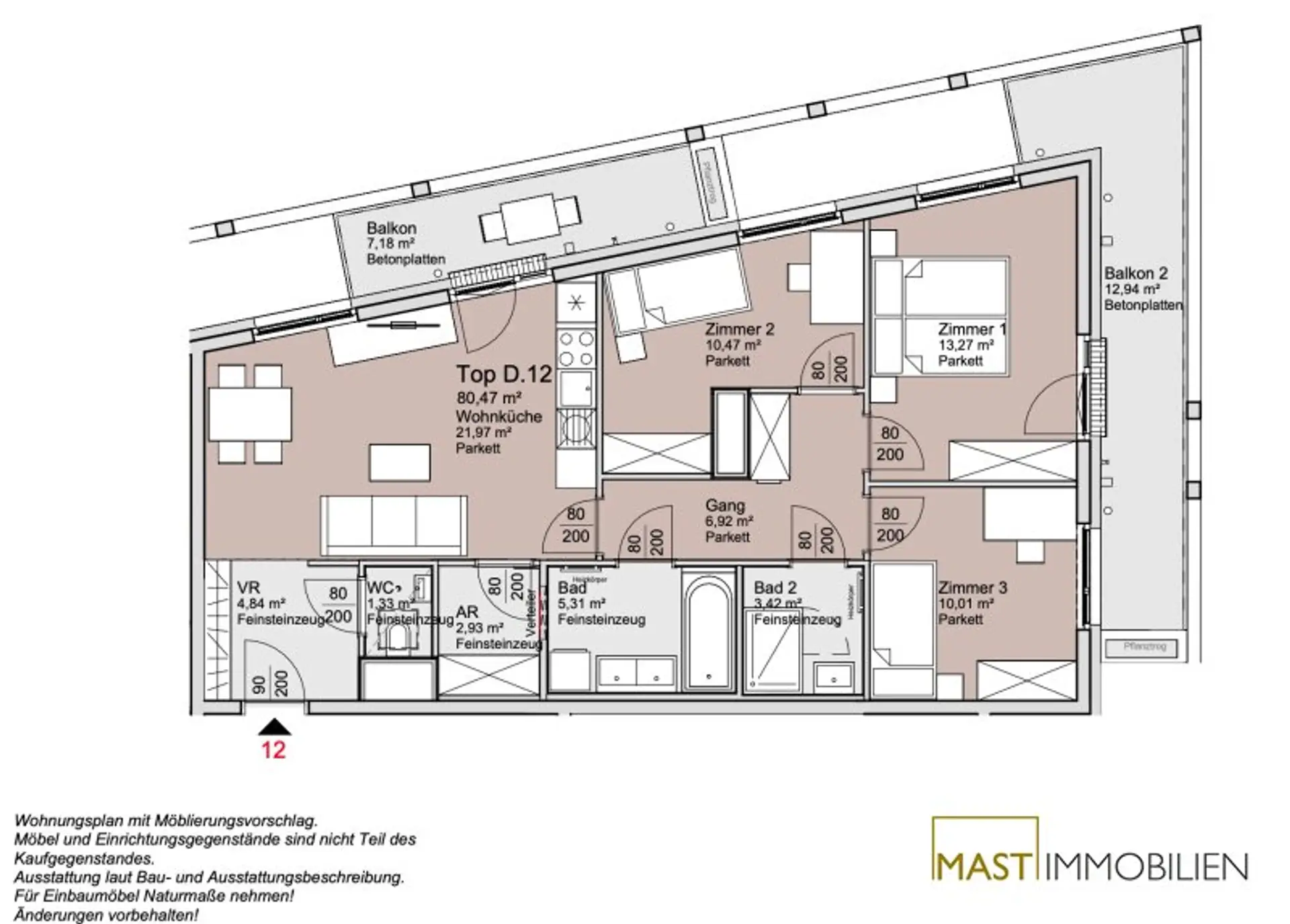 Die Wohnung befindet sich im 2. Liftstock und verfügt über 80,47 m² Wohnfläche + zwei große Balkon.