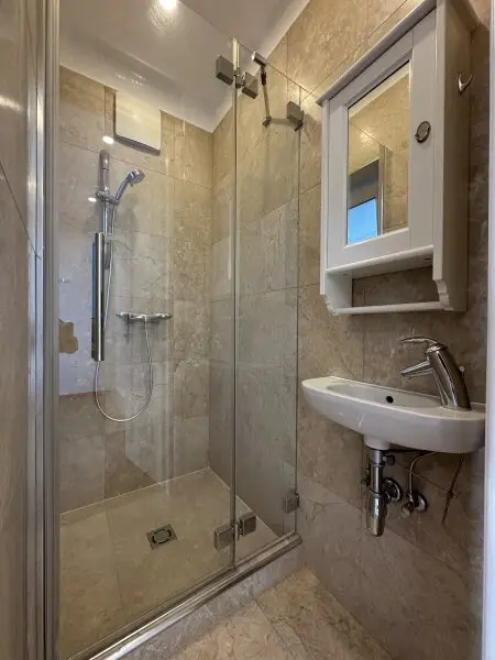 * Feinsteinzeugfliesen in den Badezimmern