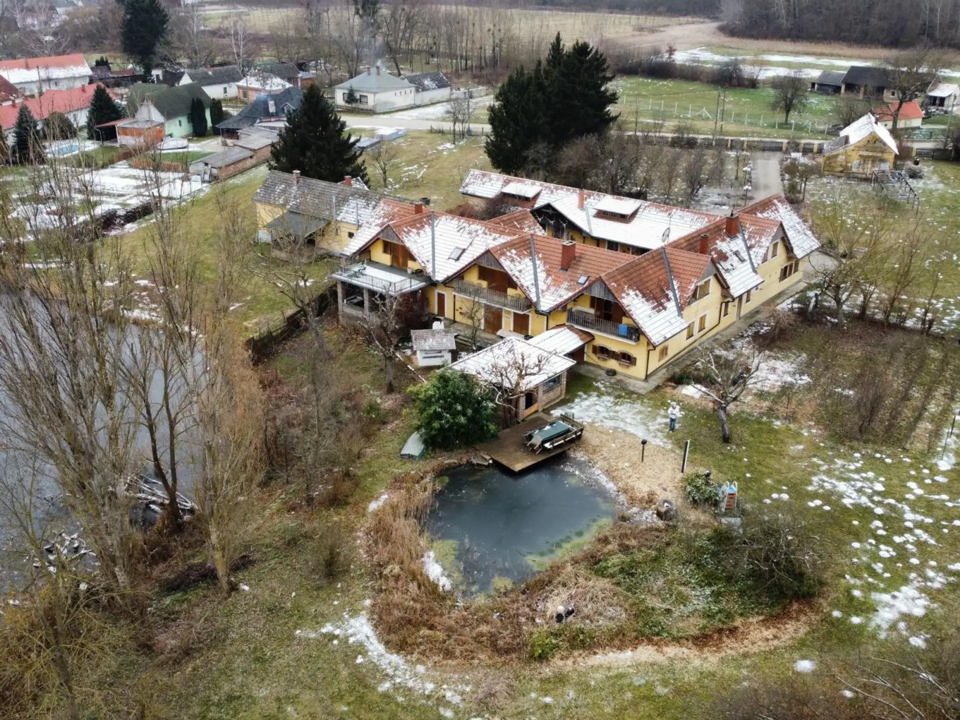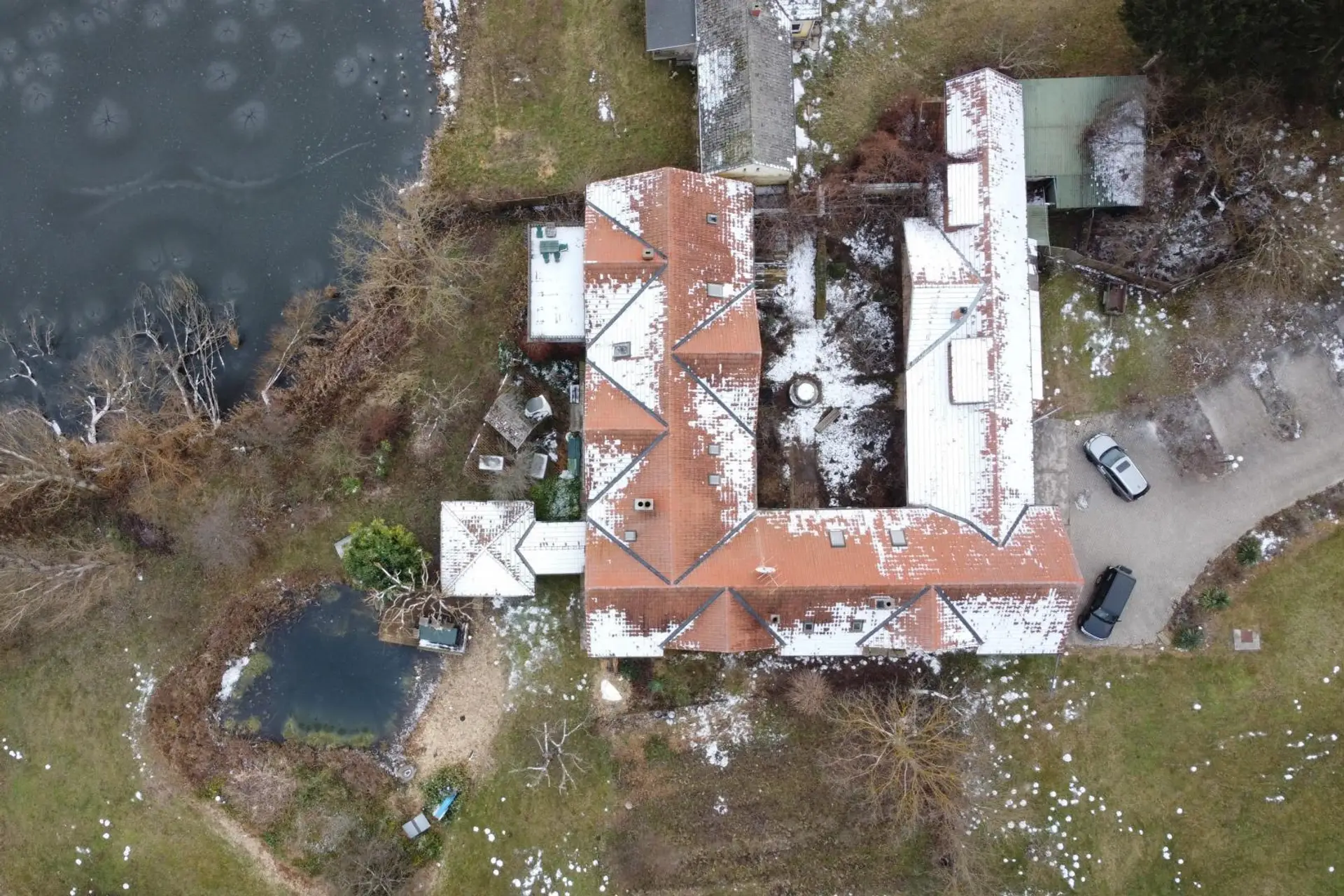Direkt an einem privaten Fischsee gelegen, umfasst das Anwesen insgesamt 27.612 m² Bauland und bietet unter anderem: