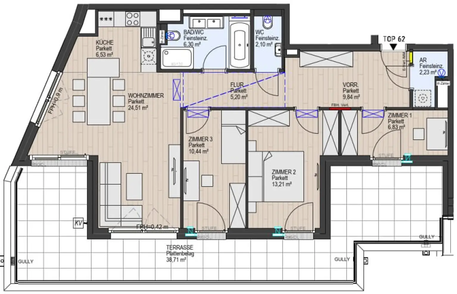 Ausstattung: Boden Bad Klimaanlage Abstellraum Fußbodenheizung Terrasse