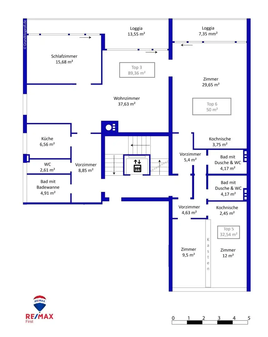 - Top 3 (2 Zimmer, Küche, Vorzimmer, Bad mit Badewanne, WC extra) mit rund 89,36 m² inkl. 13,55 m² West-Loggia