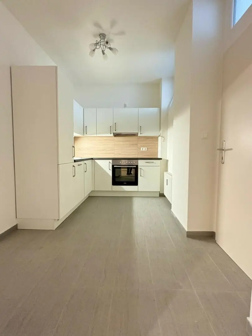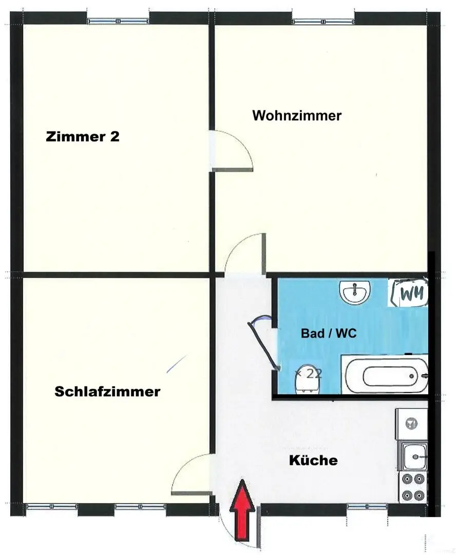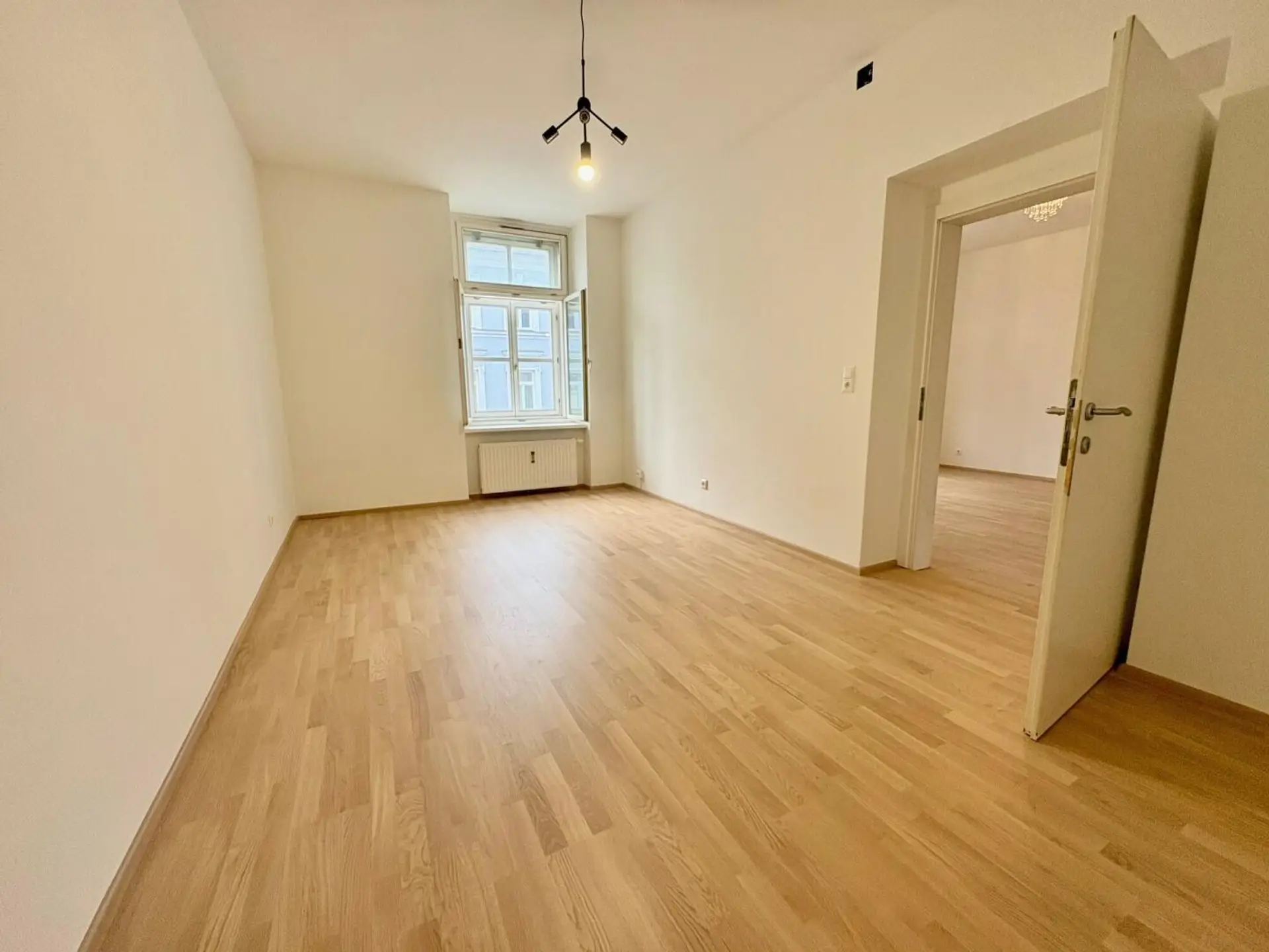 Vorraum, Badezimmer mit Wanne, WC und Waschmaschinen-Anschluss, komplett möblierte Küche (inkl. aller E-Geräte), 2 getrennt begehbare Zimmer und ein großes Wohnzimmer (Durchgehraum).